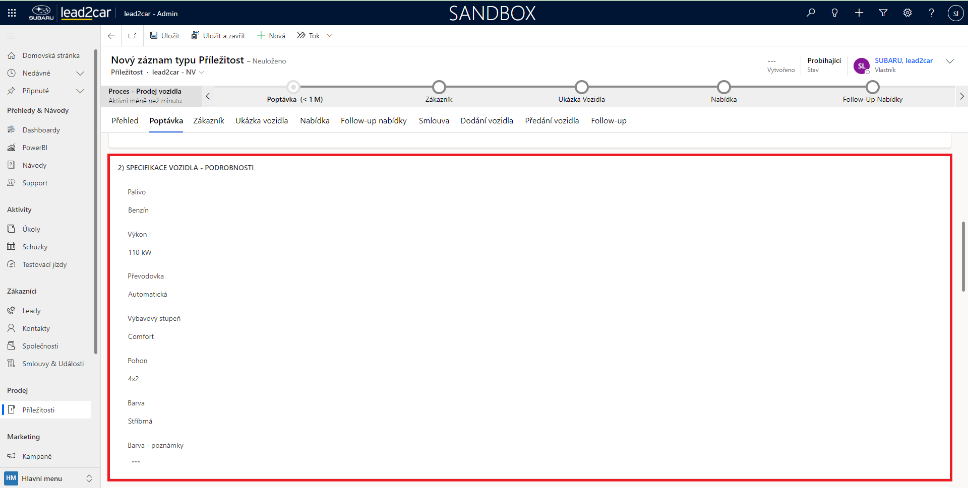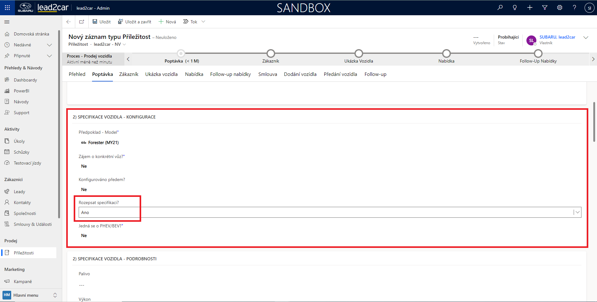 Následně vyplňte box "Specifikace vozidla - konfigurace". Zde zvolte model z databáze a vyberte, jestli je vozidlo konfigurováno předem. Máte také možnost zakliknout, zda chcete rozepsat konfiguraci. Pří volbě "Ano" se objeví box "Specifikace vozidla - podrobnosti". V tomto boxu lze blíže popsat o co má klient zájem, jaký výkon nebo palivo preferuje a další. Vše, kromě poznámky k barvě vozidla, je vybíráno z přednastavených možností.