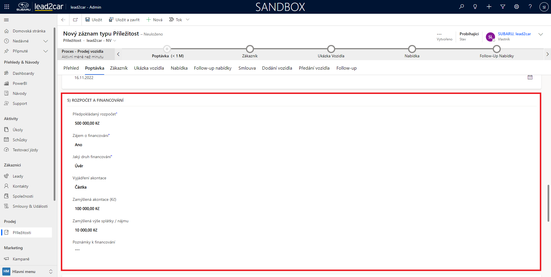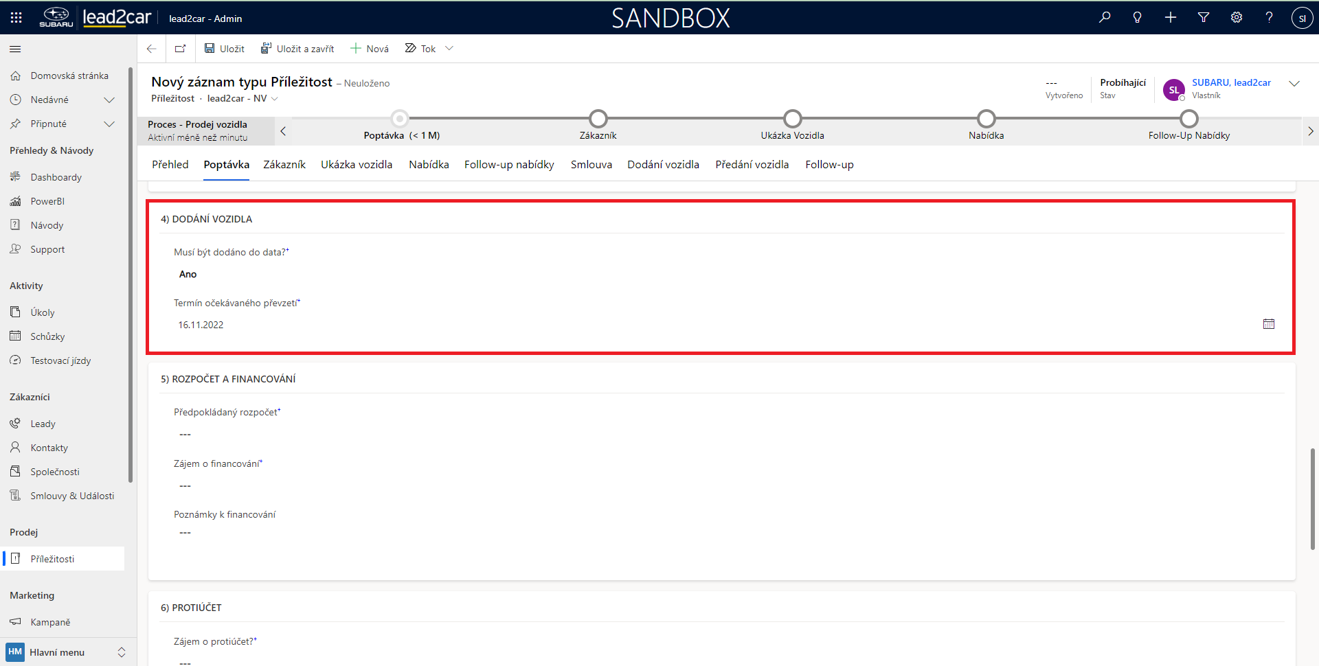 Nyní je třeba vyplnit boxy "Užívání vozidla", "Dodání vozidla" a "Rozpočet a financování". U užívání vozidla vyplňte odhadovaný rožní nájezd, poté vyberte z nabídky důvod koupě a preferenci zákazníka. U dodání vozidla zvolte z nabídky, zda musí být vozidlo dodáno do určitého data. Toto datum může být například datum dovolené zákazníka, na kterou chce jet novým vozem. Pokud vyberete možnost, že vozidlo není nutné dodat do konkrétního data, objeví se volba výběru alespoň přibližného termínu dodání. Nakonec vyplňte box "Rozpočet a financování", kam zadáte klientův předpokládaný rozpočet a informaci, zda má zájem o financování. Pokud zadáte “Ano“, objeví se několik dalších polí, kde upřesníte, o jaké financování má zákazník zájem.
