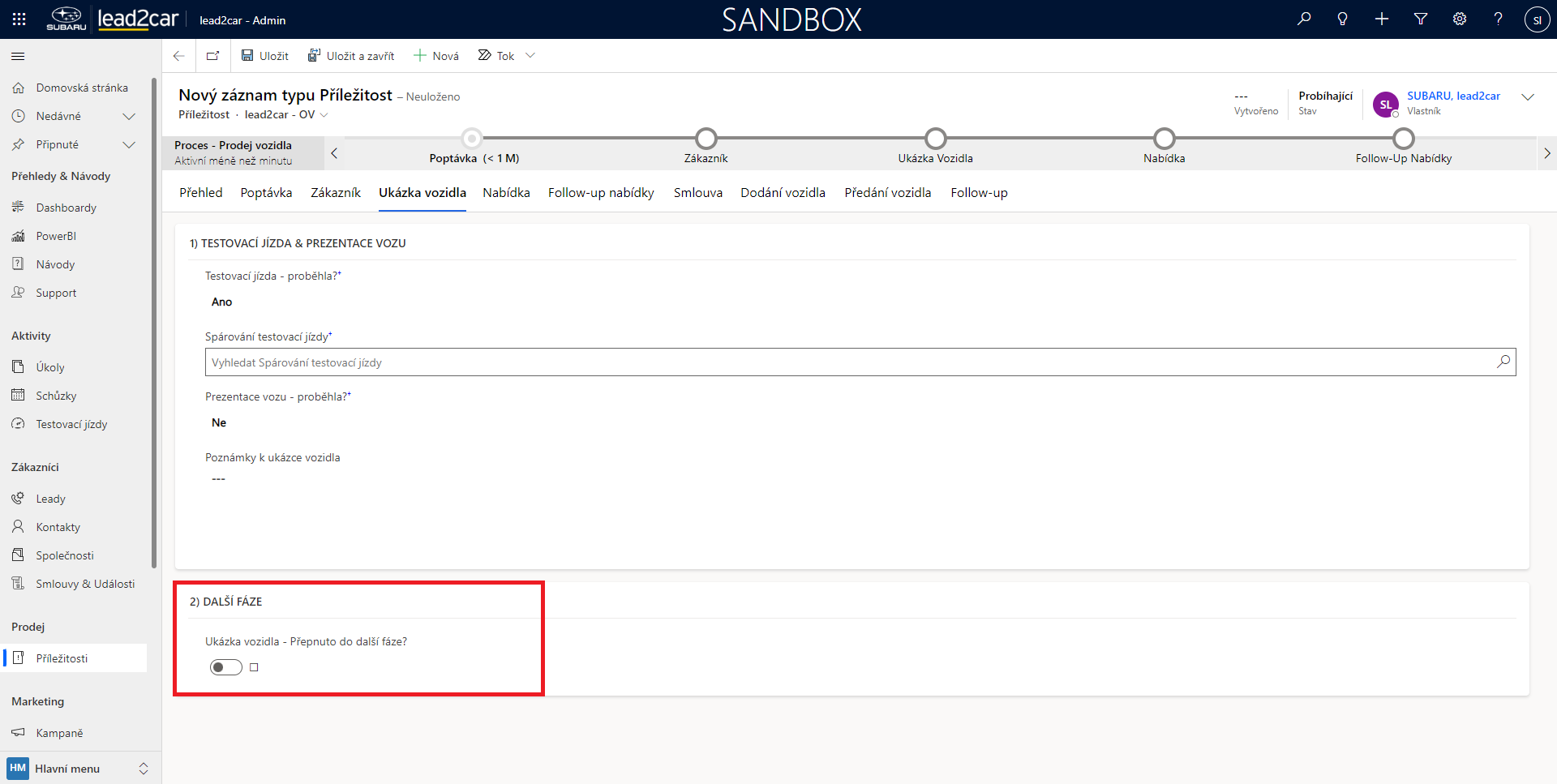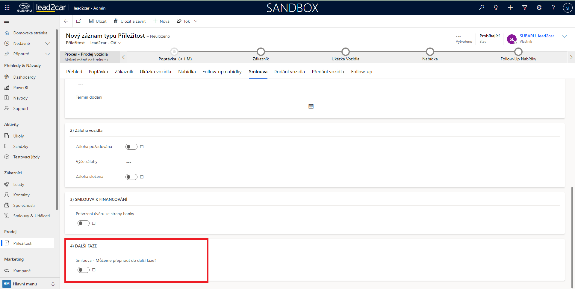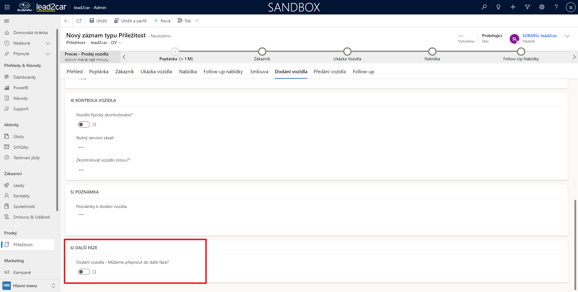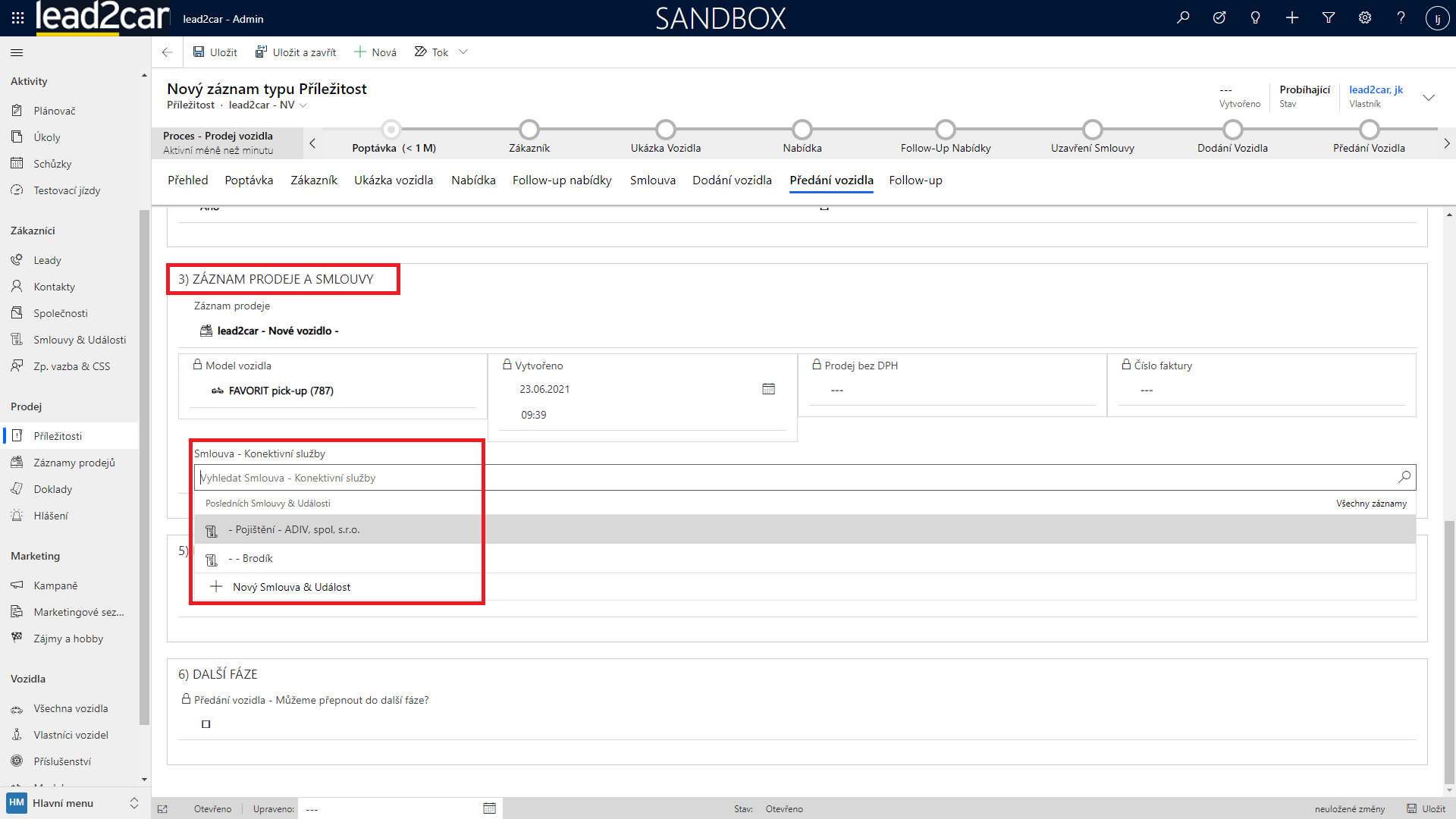 V posledním boxu je možné zakliknout "Přepnout do další fáze". Toto pole se odemkne až po uložení záznamu a po jeho zakliknutí budete automaticky přesměrováni na záložku "Dodání vozidla".