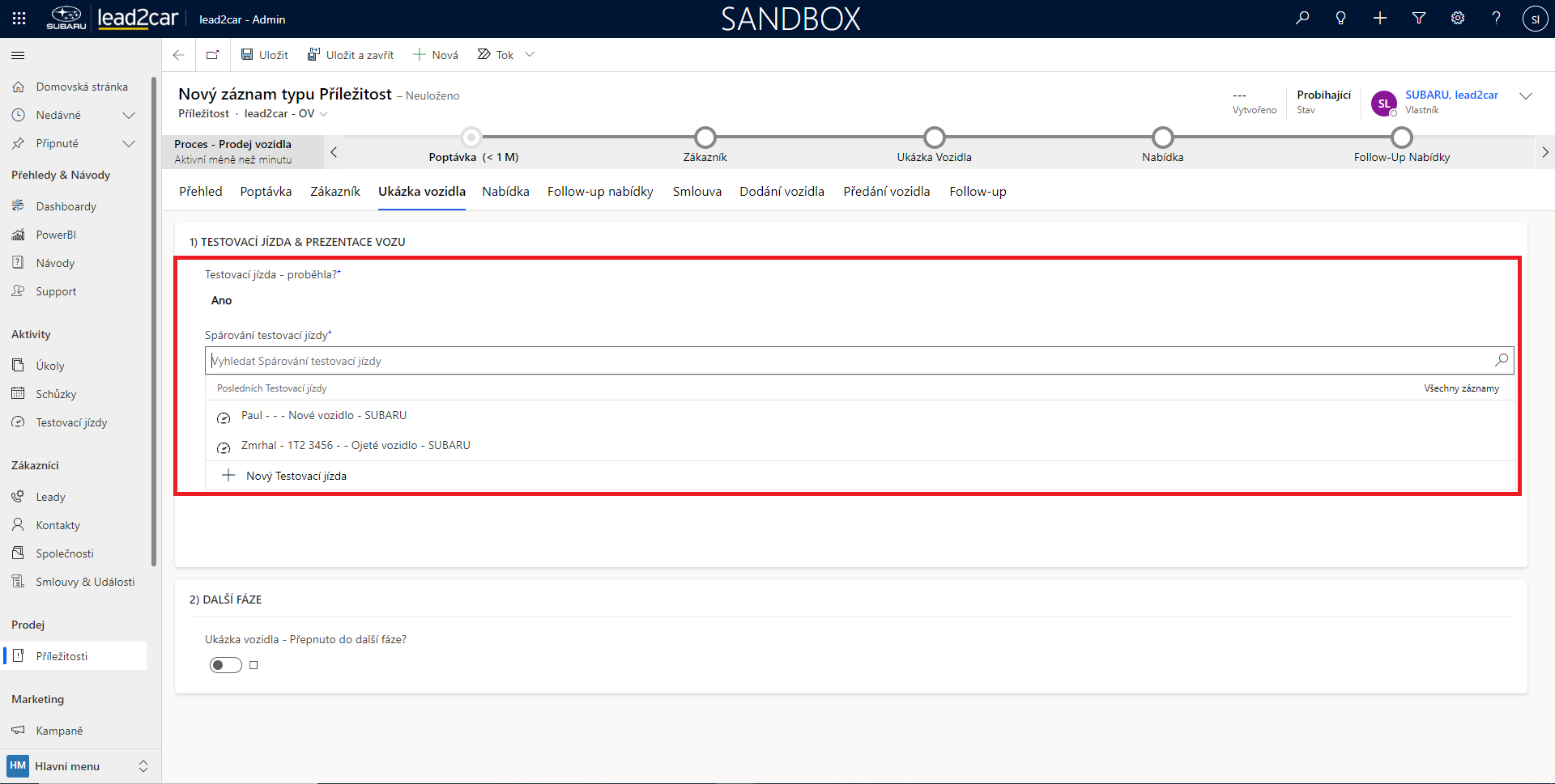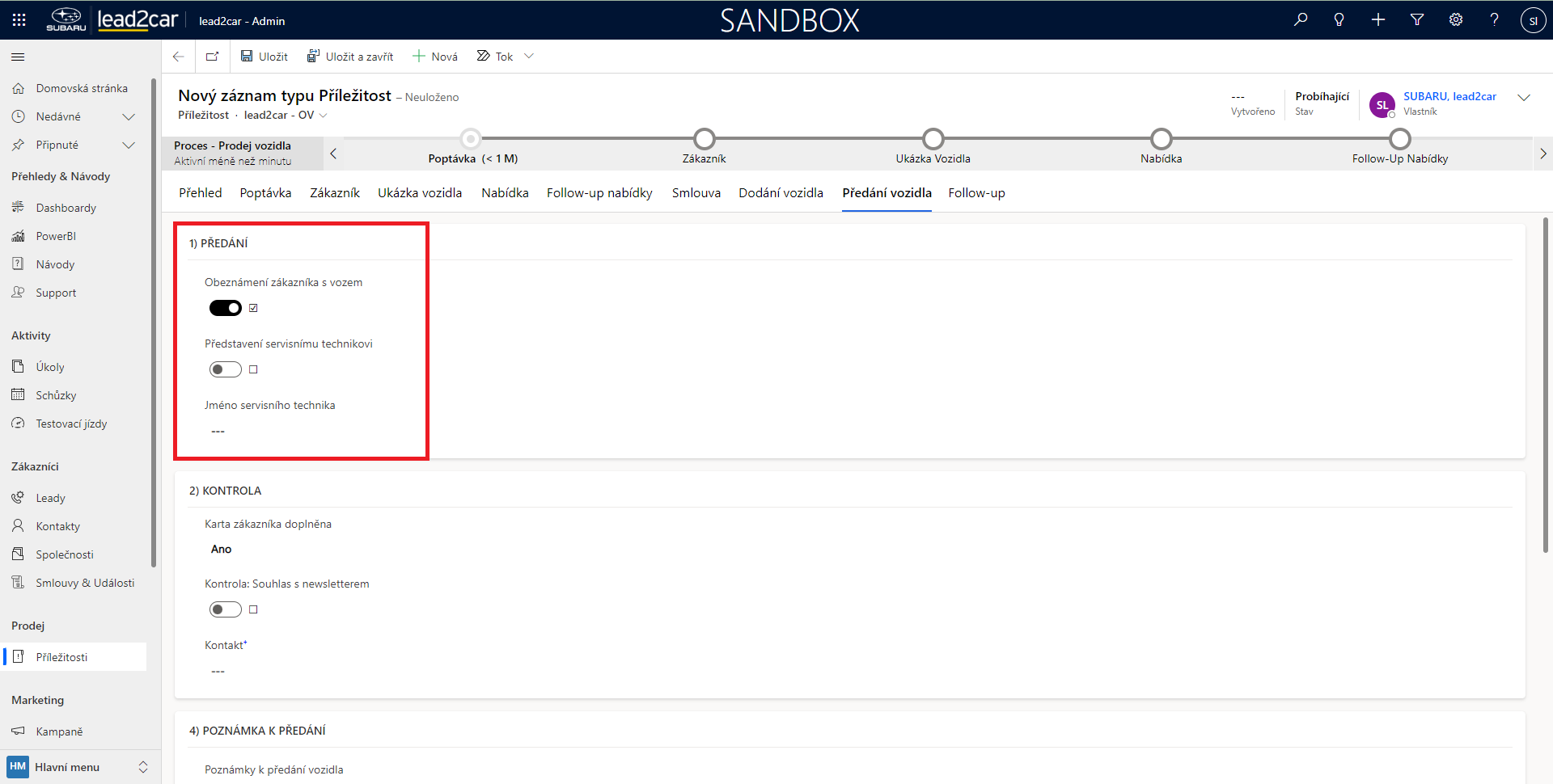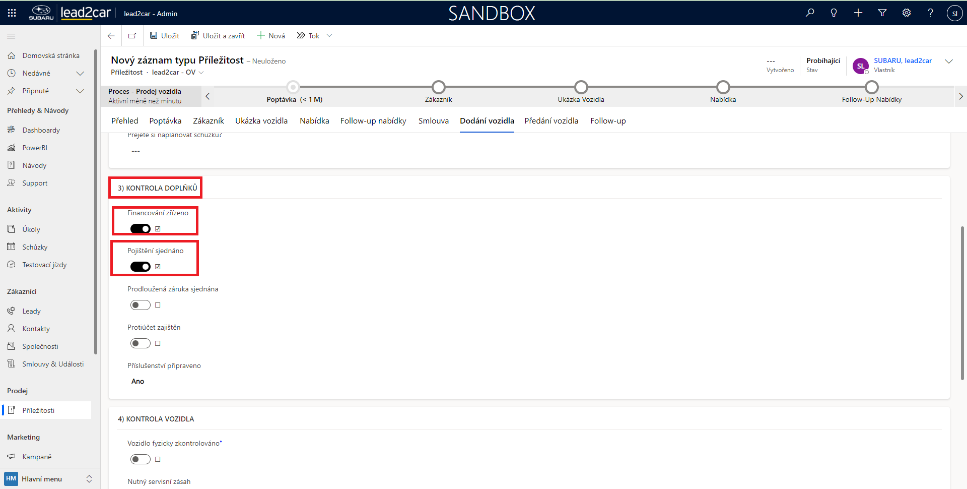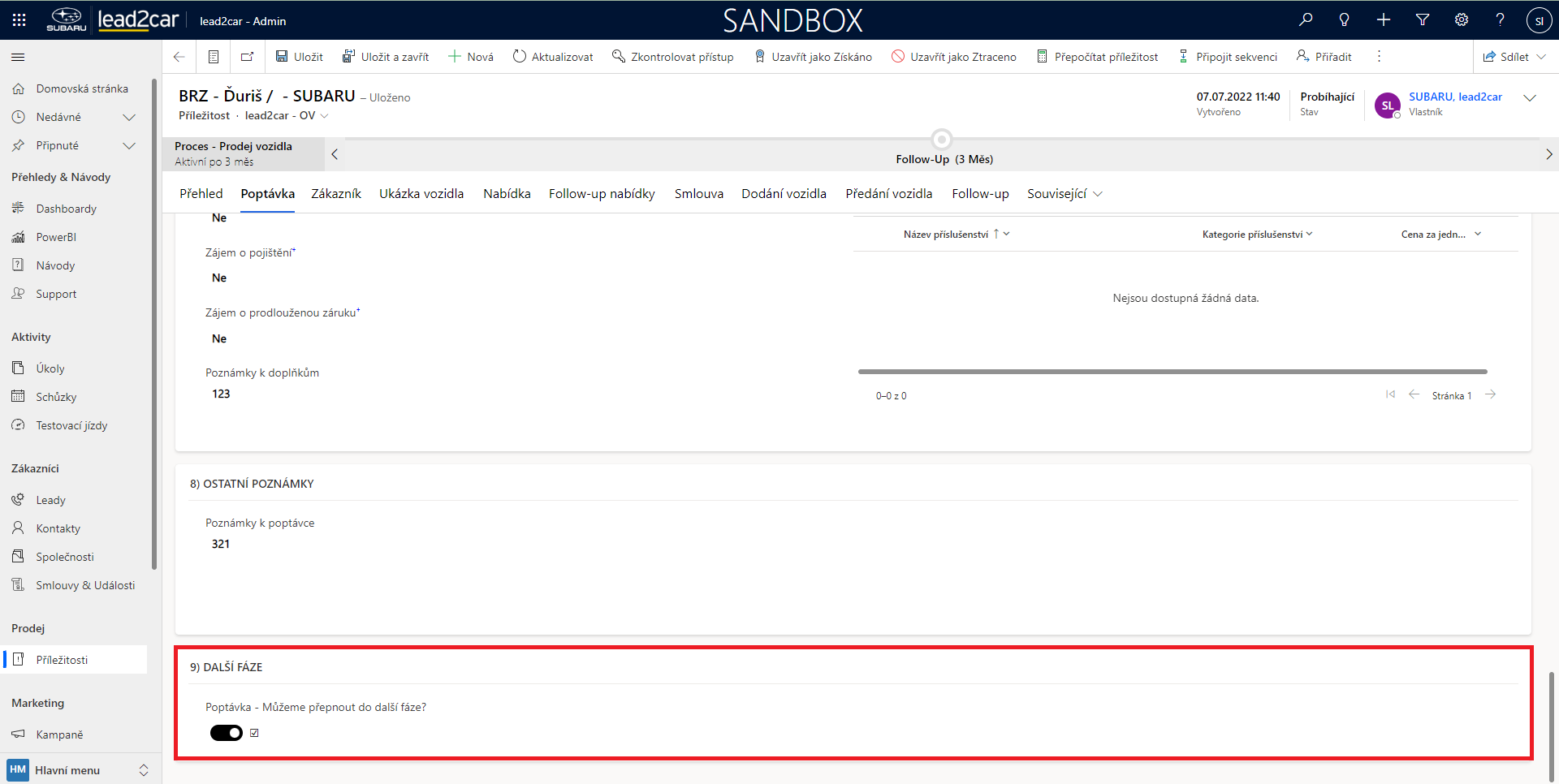 V posledním boxu je možné zakliknout "Přepnout do další fáze". Toto pole se odemkne až po uložení záznamu a po jeho zakliknutí budete automaticky přesměrováni na záložku "Dodání vozidla".