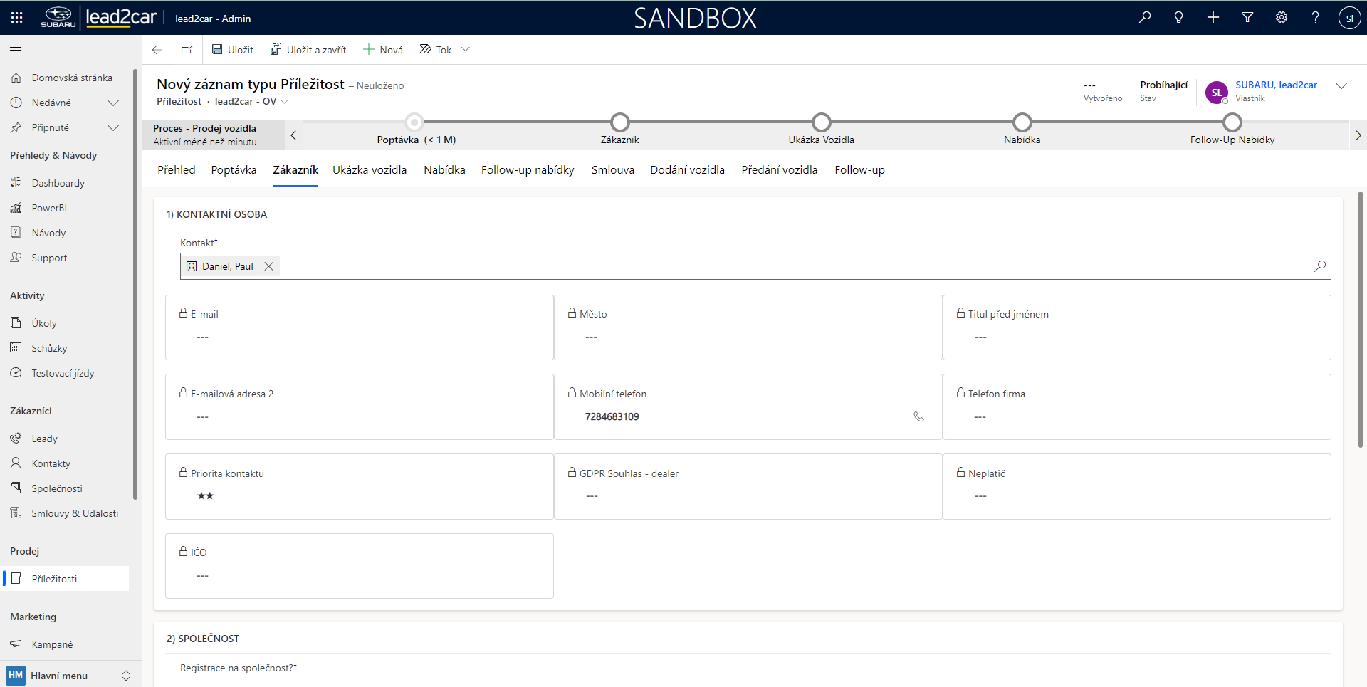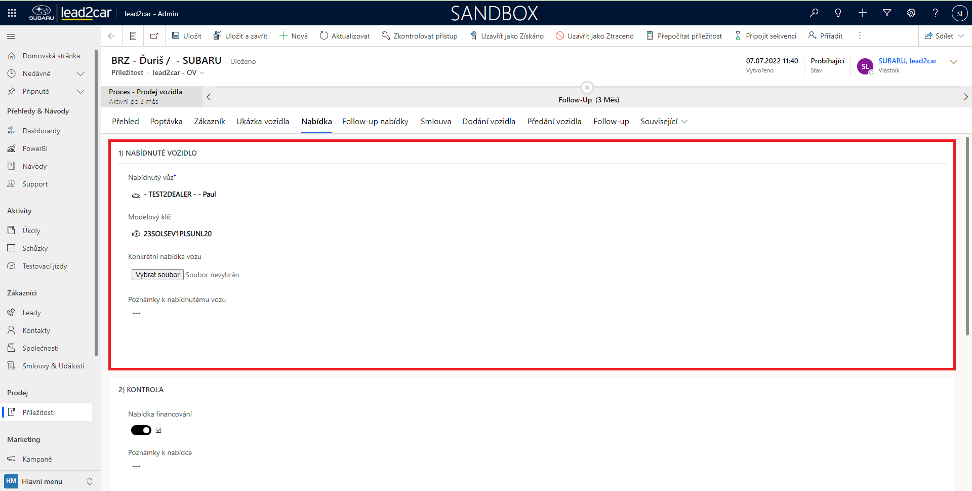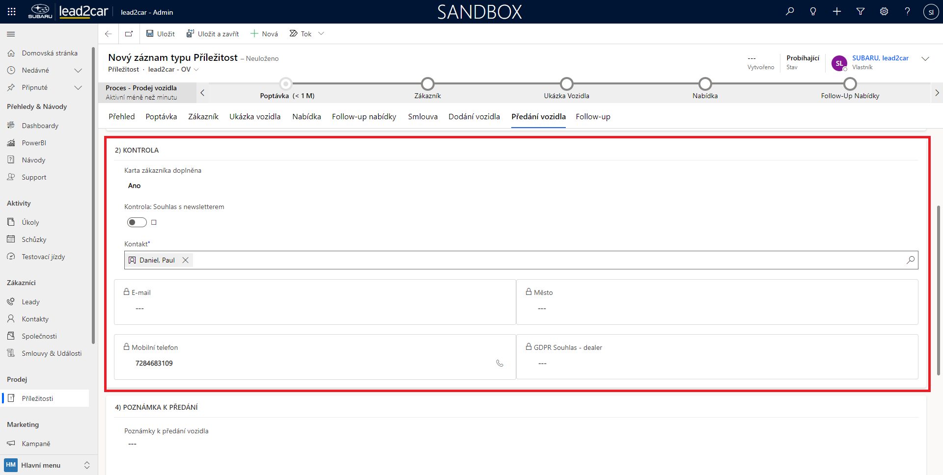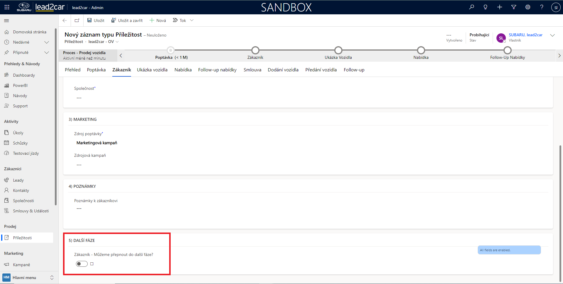 V posledním boxu je možné zakliknout "Přepnout do další fáze". Toto pole se odemkne až po uložení záznamu a po jeho zakliknutí budete automaticky přesměrováni na záložku "Dodání vozidla".
