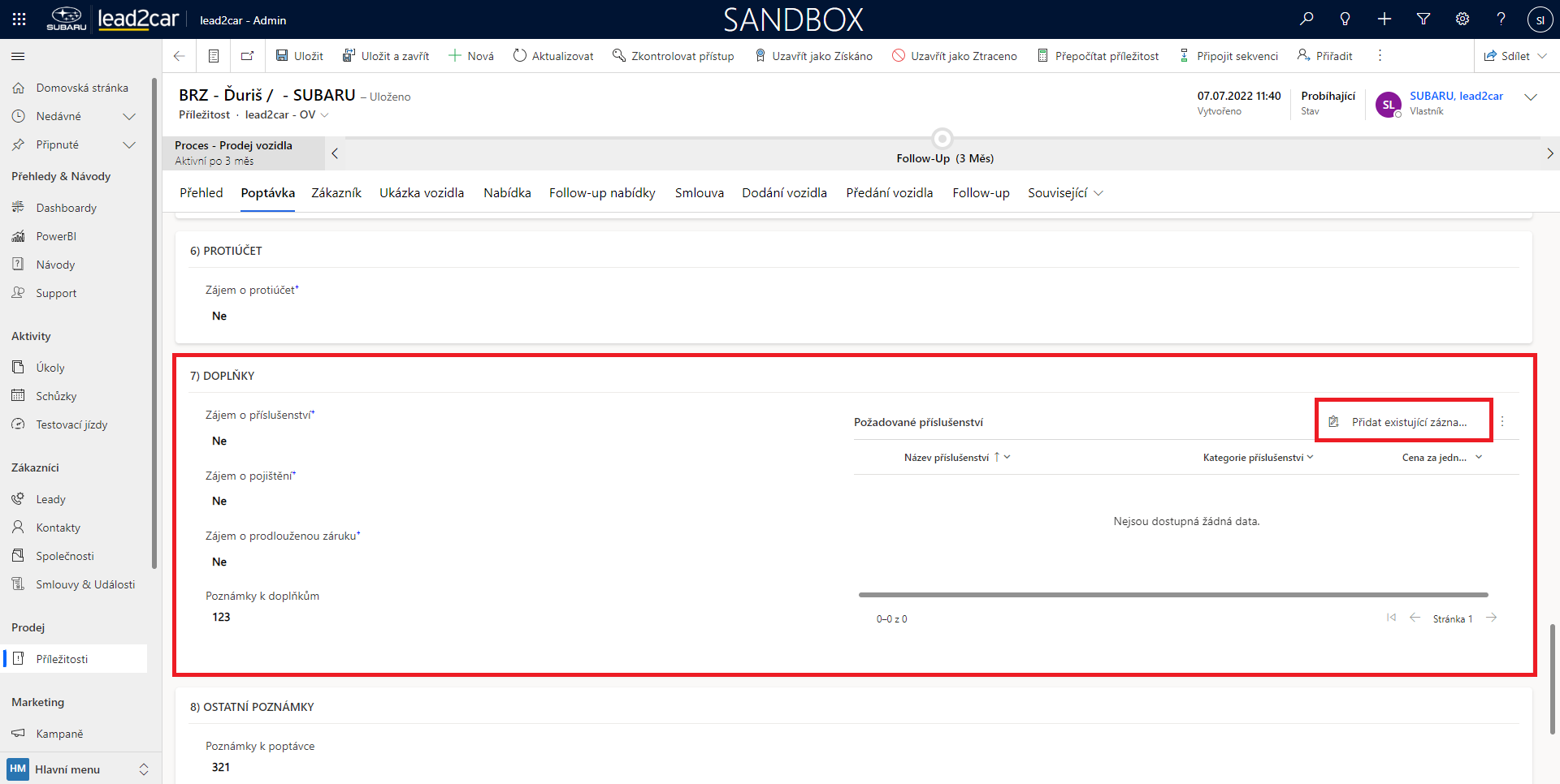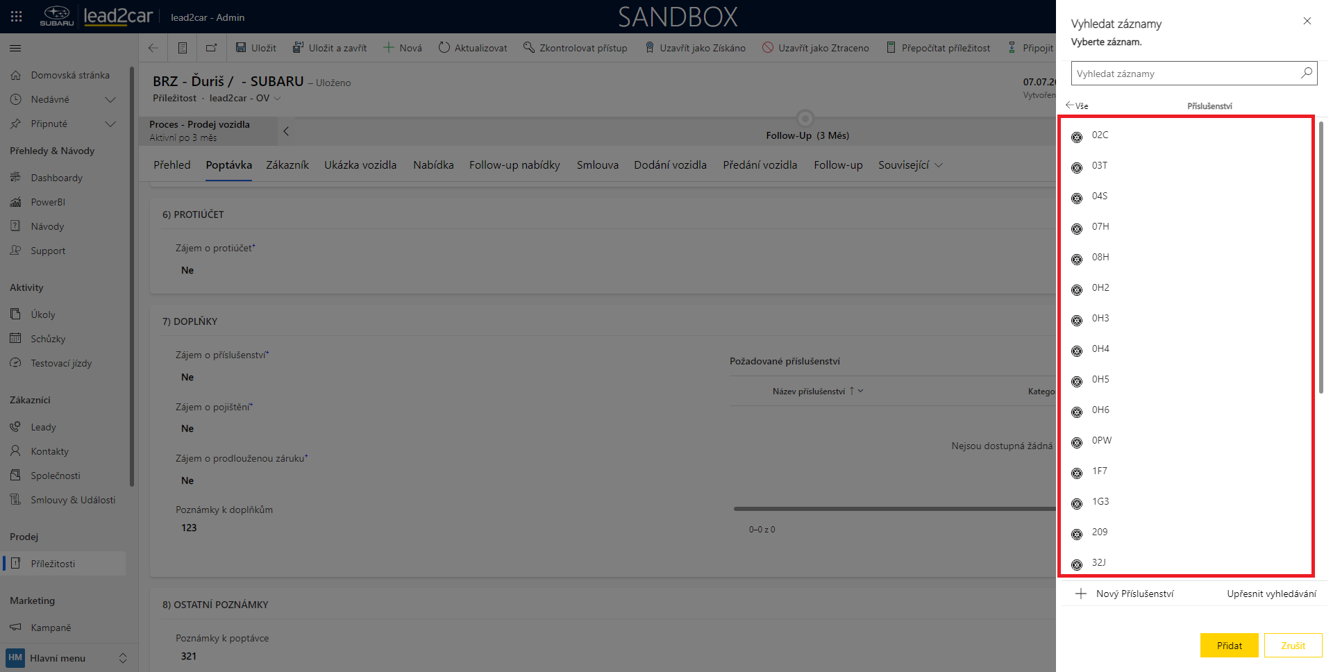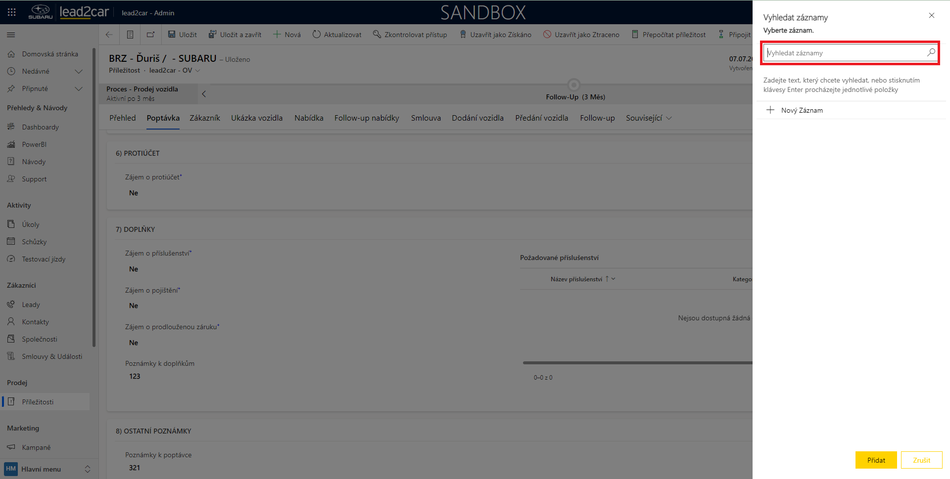 Dalším boxem, který je třeba vyplnit, jsou "Doplňky". Zde lze zvolit, zda má klient zájem o další příslušenství, pojištění či protiúčet. Pokud má Zákazník zájem o příslušenství, po uložení příležitosti klikněte na "Přidat existující záznam". Objeví se vyhledávací okno, kam lze napsat kód příslušenství, případně kliknout na ikonu lupičky a najít požadované příslušenství.