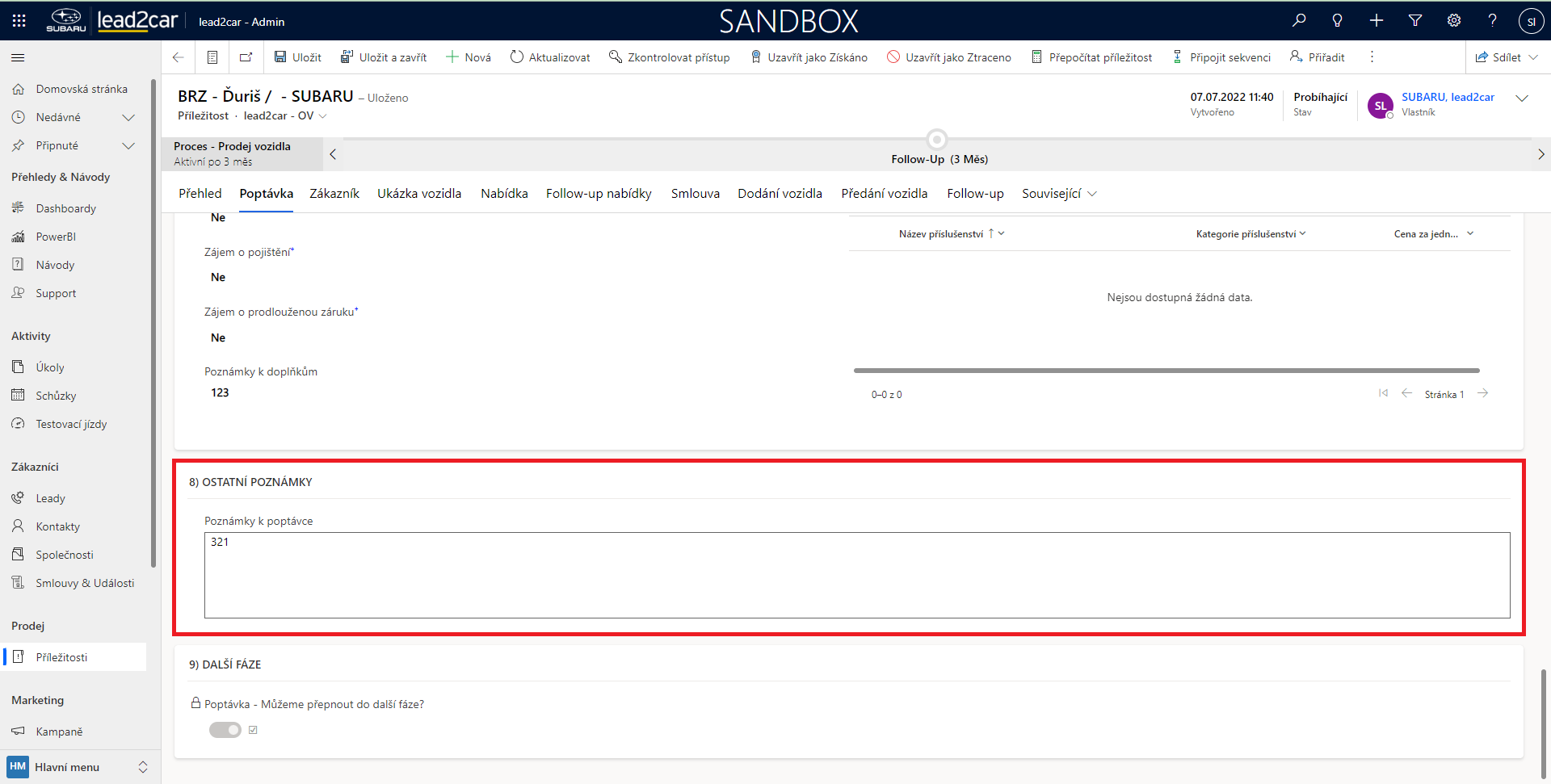 Nakonec lze k ukázce vozidla přidat poznámku. V posledním boxu je možnost zakliknout "Přepnout do další fáze". Toto pole se odemkne až po uložení záznamu a po jeho zakliknutí budete automaticky přesměrováni na záložku "Nabídka".
