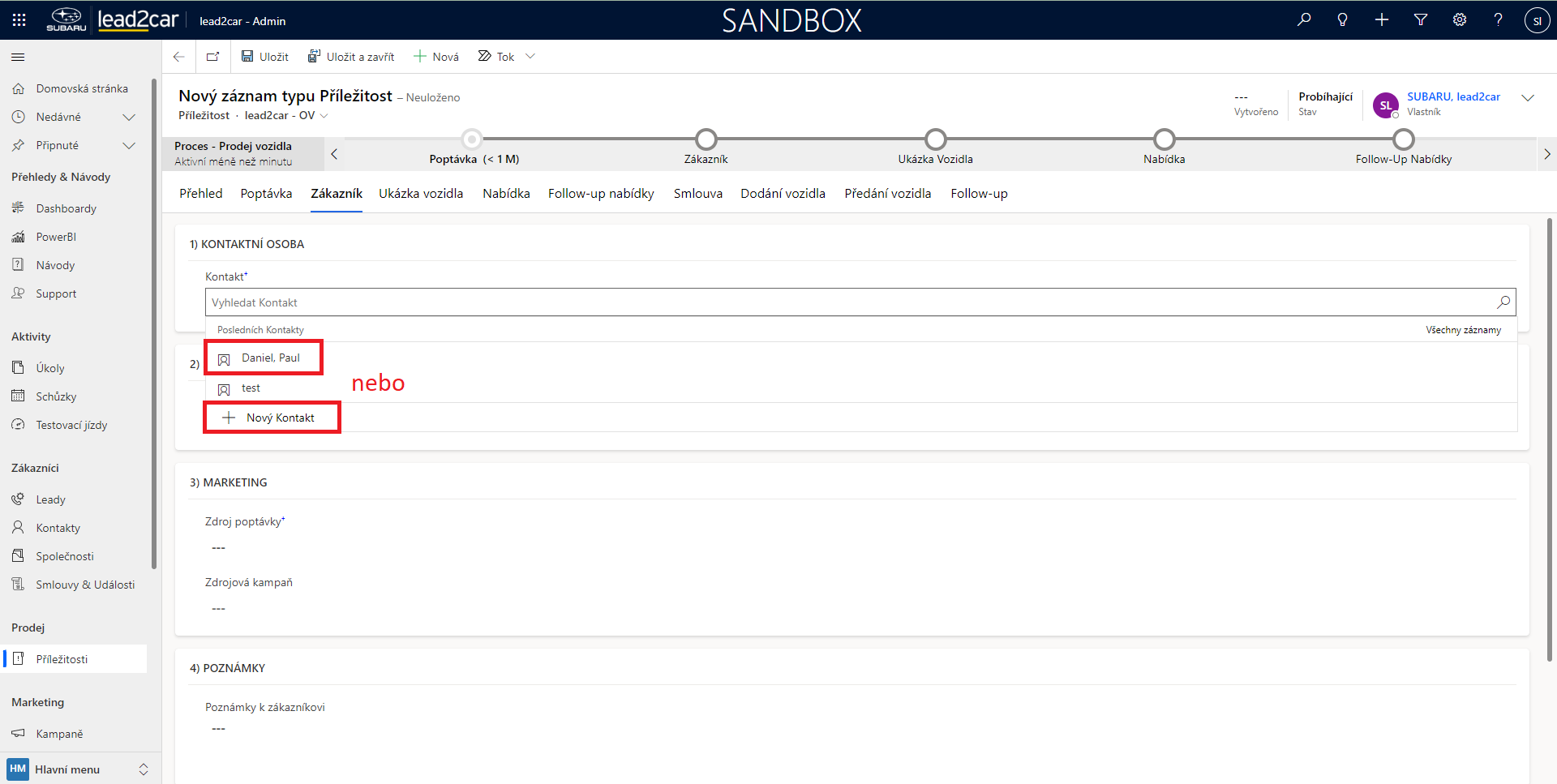 Karta "Ukázka vozidla" slouží k zaznamenání prvního kontaktu zákazníka s vozidlem. Jako první lze označit, jestli se zákazník zúčastnil testovací jízdy. Pokud ano, v poli "Spárování testovací jízdy" je možné vybrat konkrétní testovací jízdu z databáze. Pokud daná jízda v databázi chybí, je třeba ji přidat pomocí volby "+ Nový Testovací jízda". Dále lze zaznamenat, jestli proběhla ukázka vozu a zapsat si k ukázce vozidla poznámku.
