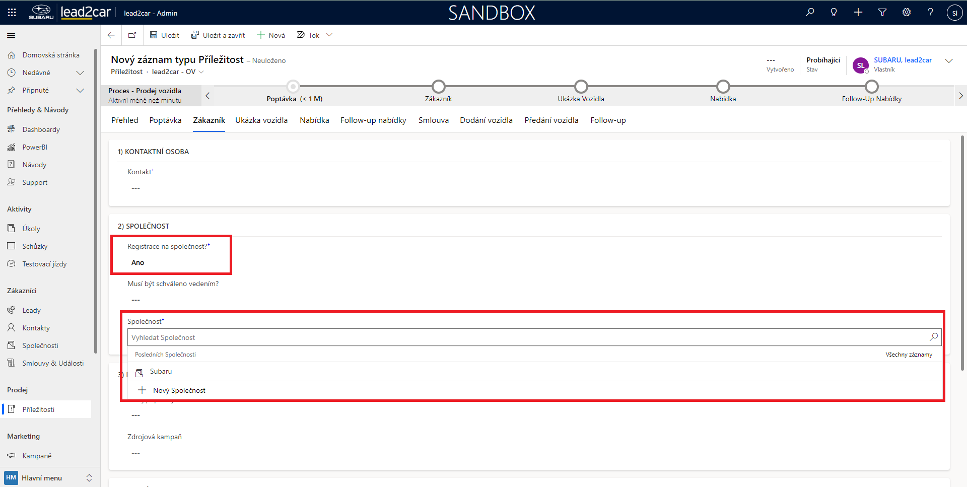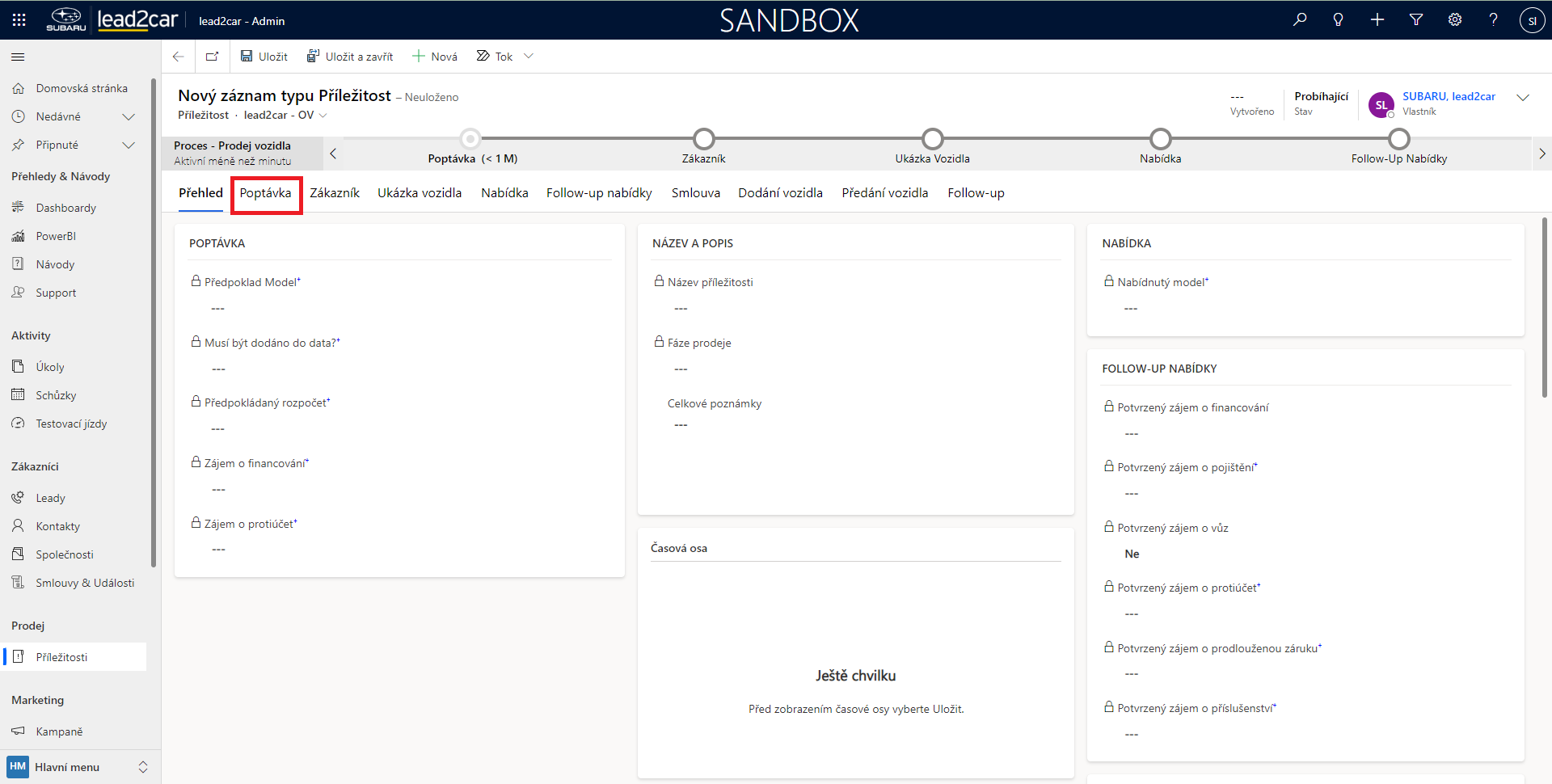 Otevře se formulář nové příležitosti pro OV. Nahoře je znázorněn obchodní proces (modrý) a pod ním jsou jednotlivé záložky. Formulář se automaticky otevře na záložce "Přehled". Tato záložka slouží k rychlému zorientování se v Příležitosti, nicméně při vyplňování formuláře je třeba začít nejprve s kartou Poptávka (červeně).