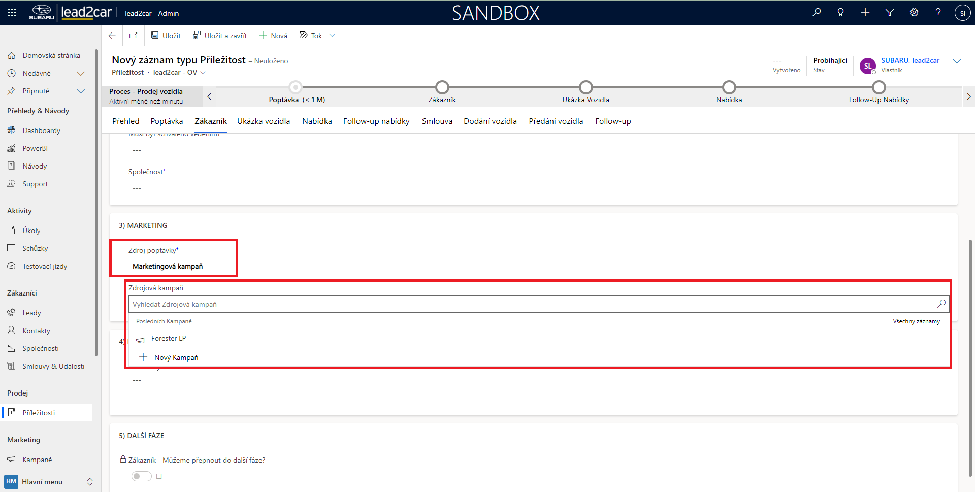 V poli marketing vyberte zdroj poptávky zákazníka z daných možností a lze přidat i zdrojovou kampaň z databáze. Pokud daná kampaň není uvedena, je možné ji přidat pomocí volby "+ Nový Kampaň".