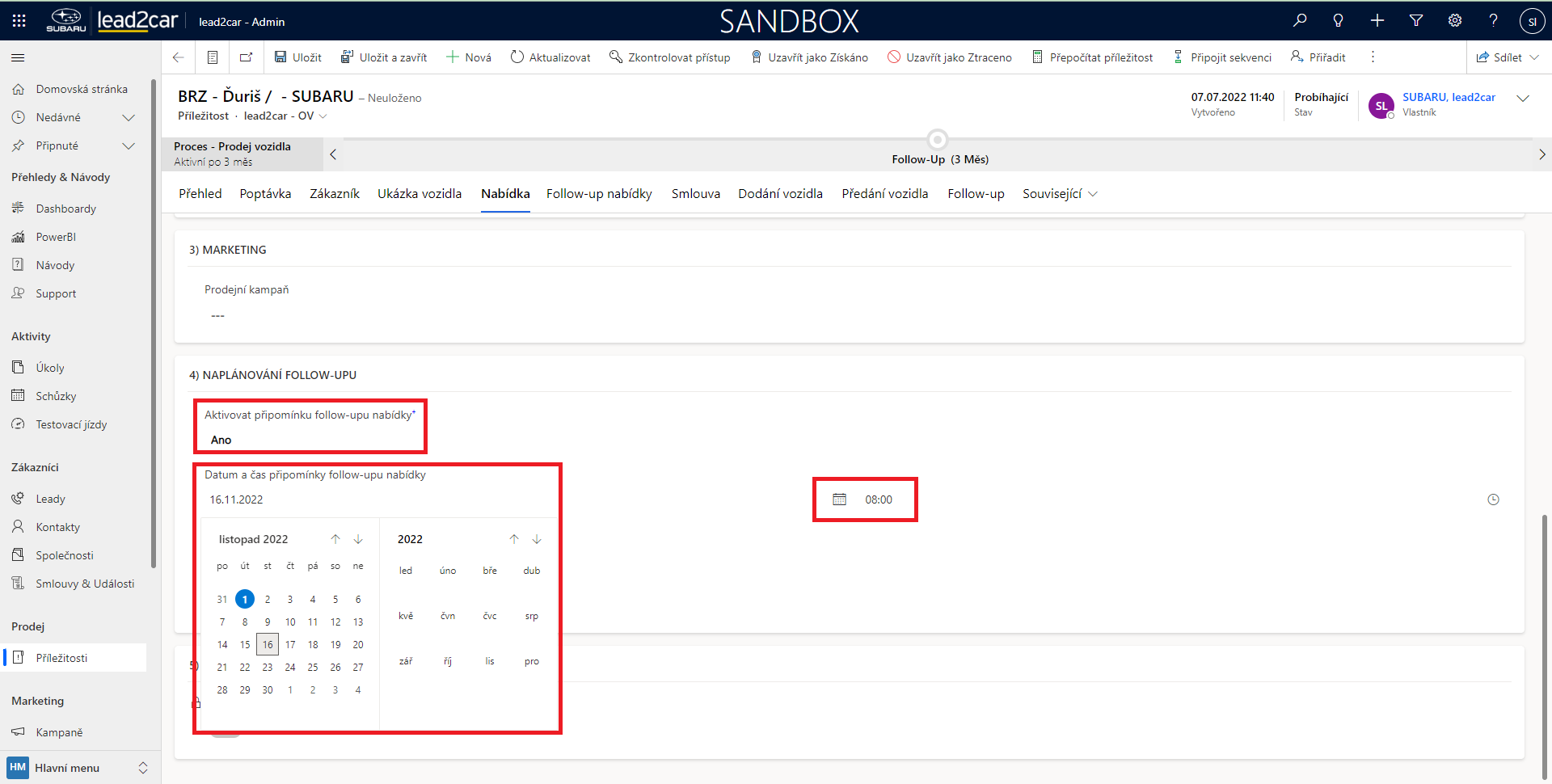 V posledním boxu lze zakliknout "Přepnout do další fáze". Toto pole se odemkne až po uložení záznamu a po jeho zakliknutí budete automaticky přesměrováni na záložku "Follow-up".