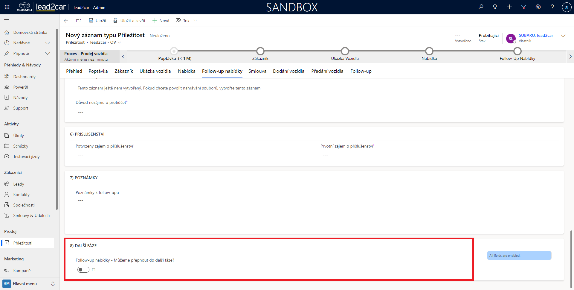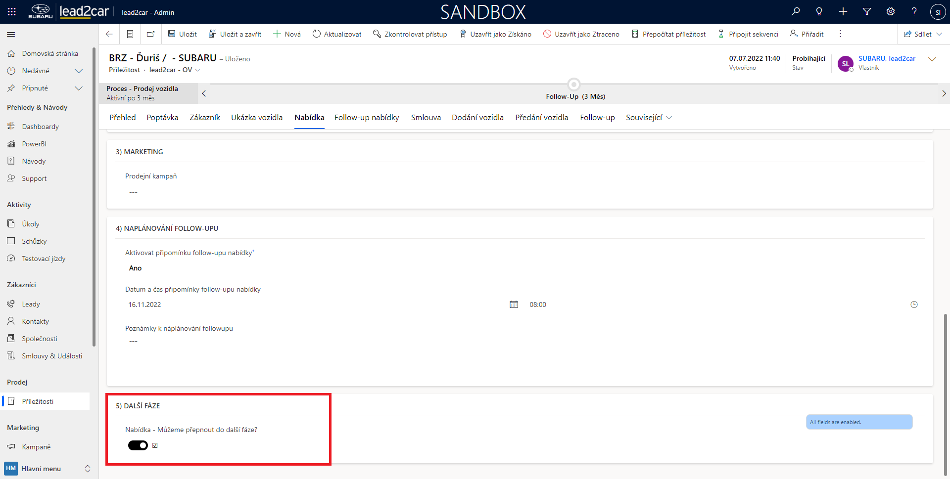 V posledním boxu lze zakliknout "Přepnout do další fáze". Toto pole se odemkne až po uložení záznamu a po jeho zakliknutí budete automaticky přesměrováni na záložku "Follow-up nabídky".