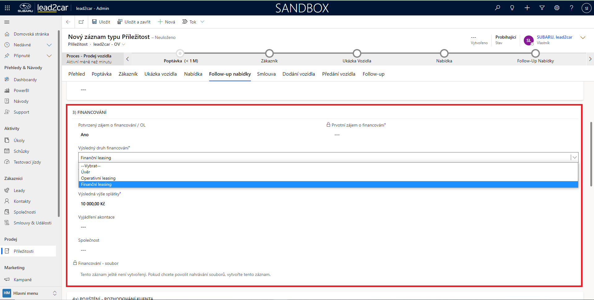 Zde lze zaznamenat detaily zákazníkova zájmu nebo nezájmu o financování. Na základě toho, jestli zákazník zájem má nebo ne, se otevřou rozdílná pole, kde je možné vyplnit konkrétní detaily (ne)zájmu, jako je délka financovaní nebo výsledná výše splátky.
