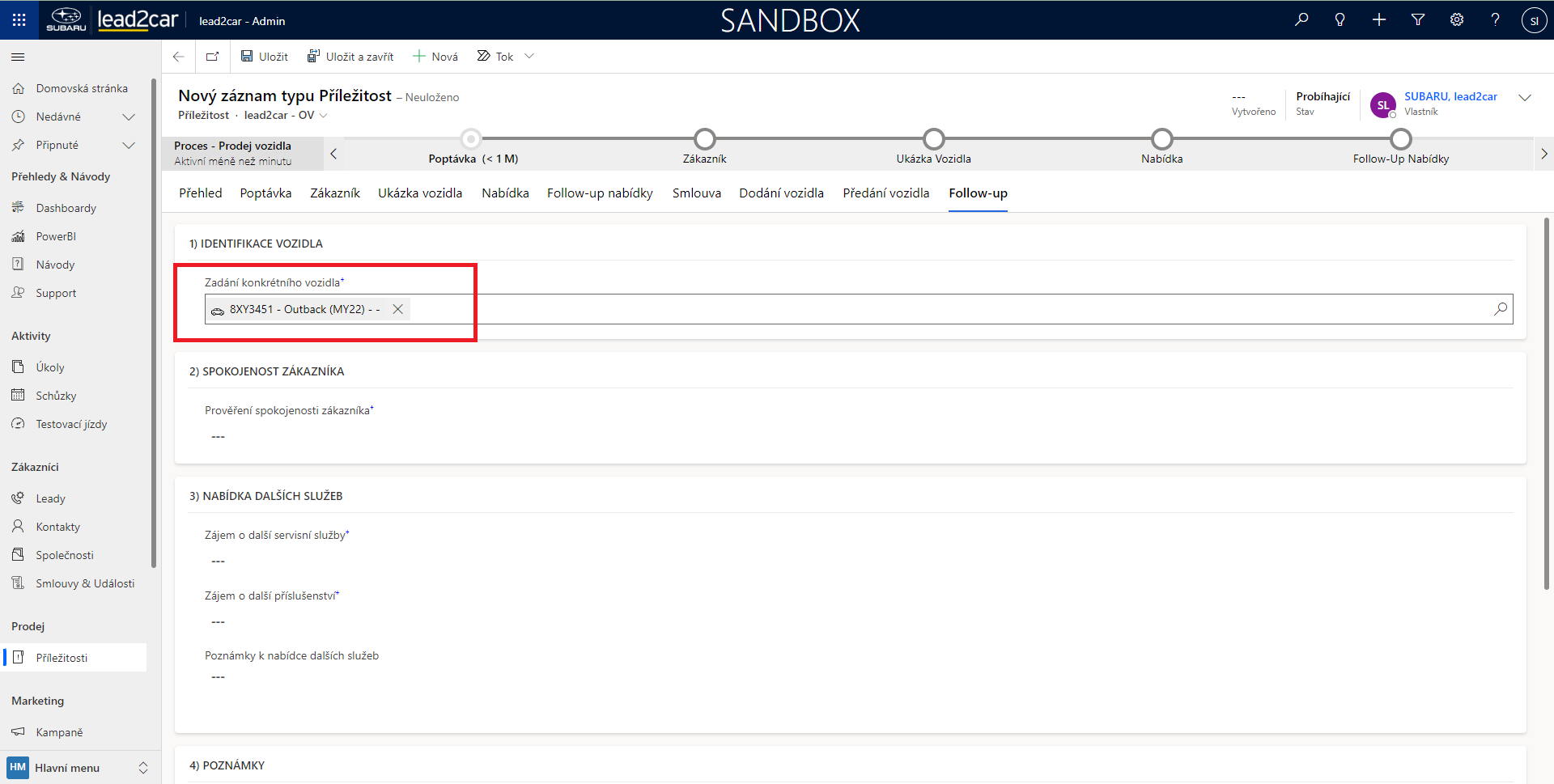 V poli identifikace vozidla vyberte konkrétní vozidlo, týkající se příležitosti z databáze vozidel. Pokud v databázi vozidlo není, lze ho přidat pomocí volby "+ Nový Vozidlo". Po výběru vozidla se zobrazí některé detaily vozidla. Lze zde také přidat odhadovanou délku vlastnictví vozidla v měsících.
