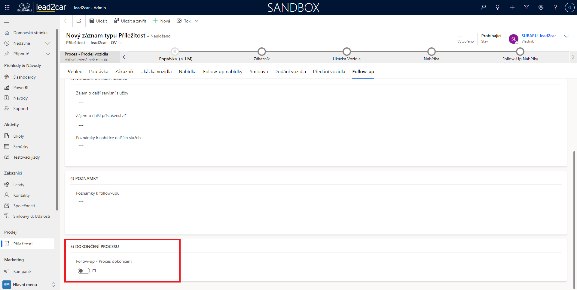 V posledním boxu lze zakliknout "Proces dokončen". Toto pole se odemkne až po uložení záznamu a po jeho zakliknutí bude příležitost přeřazena mezi uzavřené příležitosti.