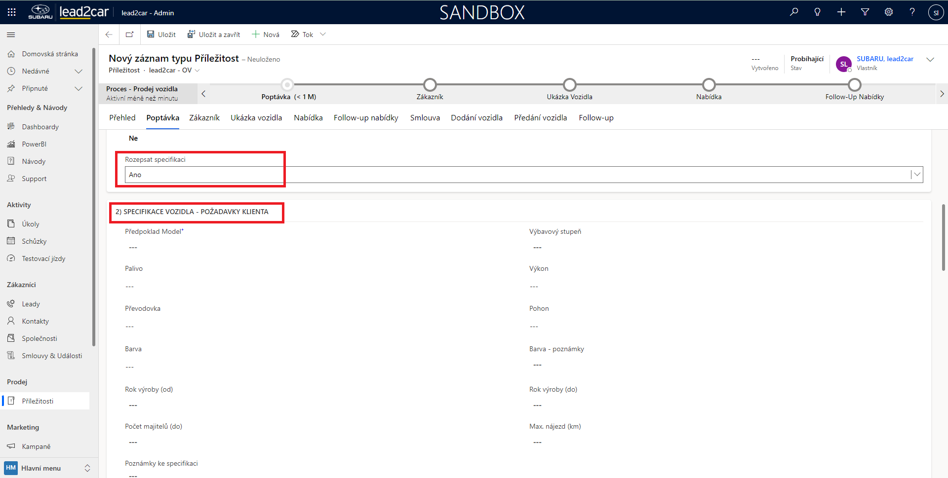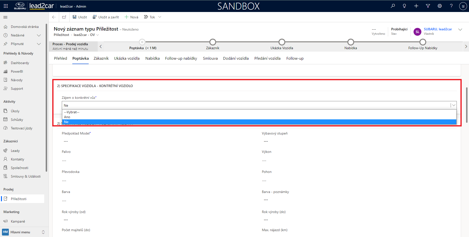 Nejdříve je nutné vyplnit box "Obecné". V poli "Specifikace vozidla - konkrétní vozidlo" určete, zda má zákazník zájem o konkrétní vozidlo. Pokud zvolíte "Ano", objeví se políčko na výběr daného vozidla z databáze. Po zakliknutí možnosti "Ne" nebo výběru možnosti "Ano" v políčku "Rozepsat specifikaci" se zobrazí pole "Specifikace vozidla - požadavky klienta".