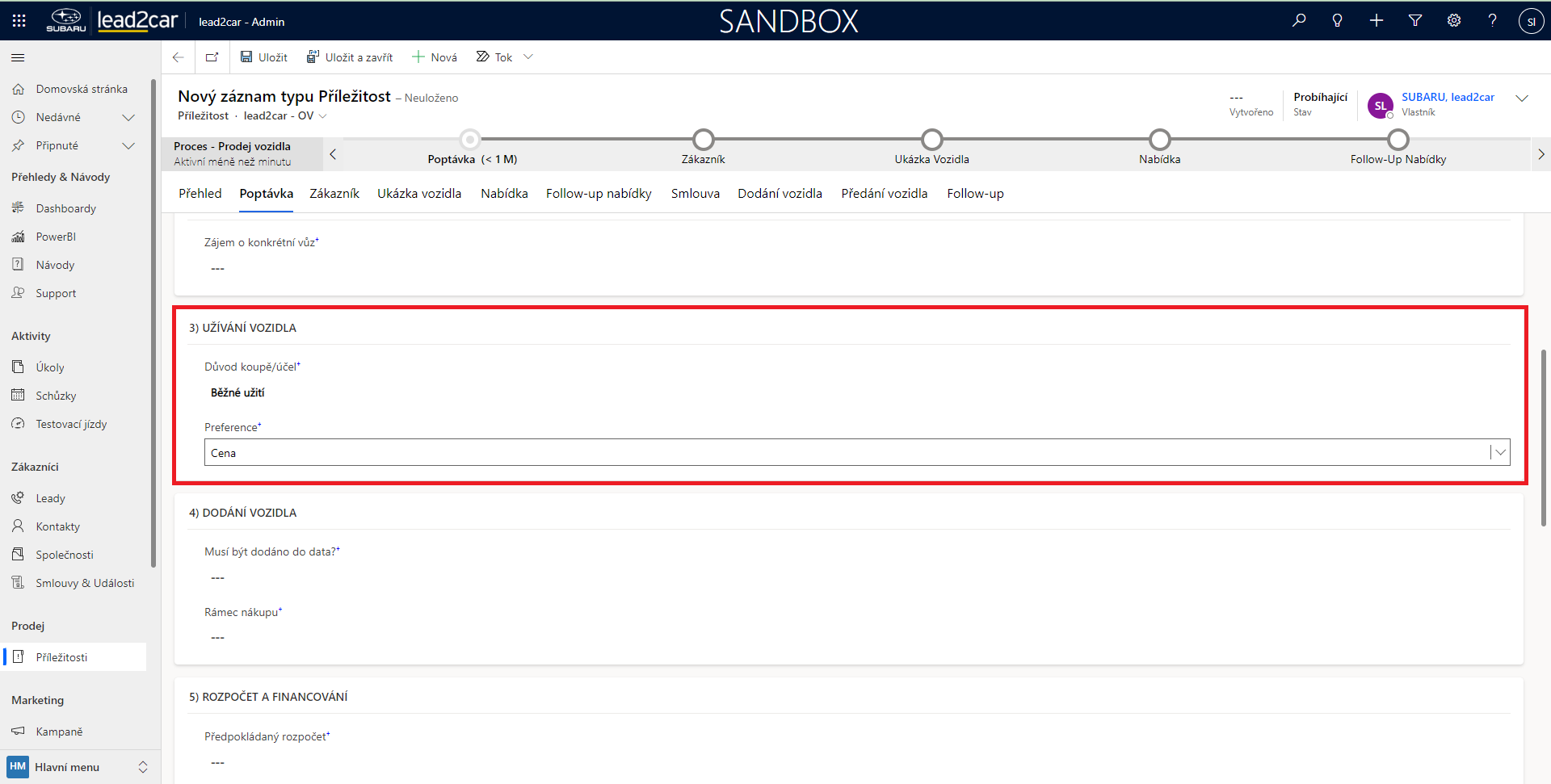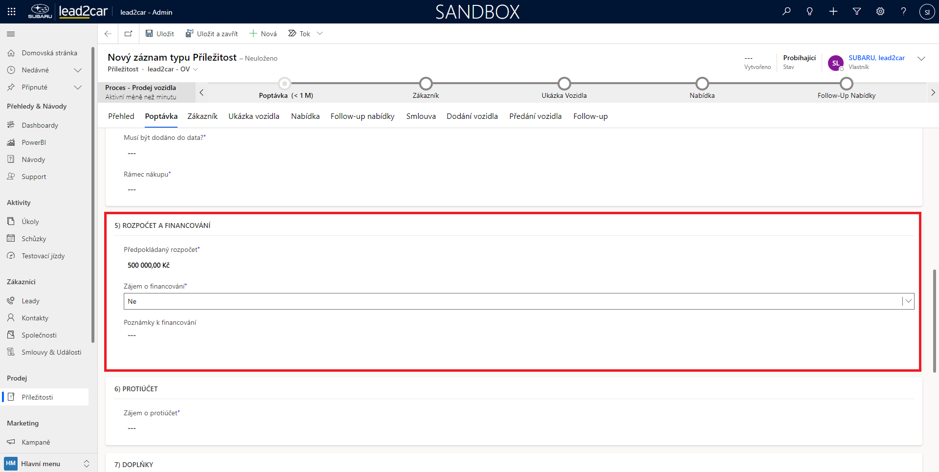 Nyní vyplňte boxy "Užívání vozidla" a "Rozpočet a financování". U užívání vozidla vyplňte odhadovaný roční nájezd, poté vyberete z nabídky důvod koupě a preferenci zákazníka. Nakonec vyplňte box "Rozpočet a financování", kam zadejte klientův předpokládaný rozpočet a zda má zájem o financování. Pokud zadáte „Ano“, objeví se několik dalších polí, kde je třeba upřesnit, o jaké financování má zákazník zájem.