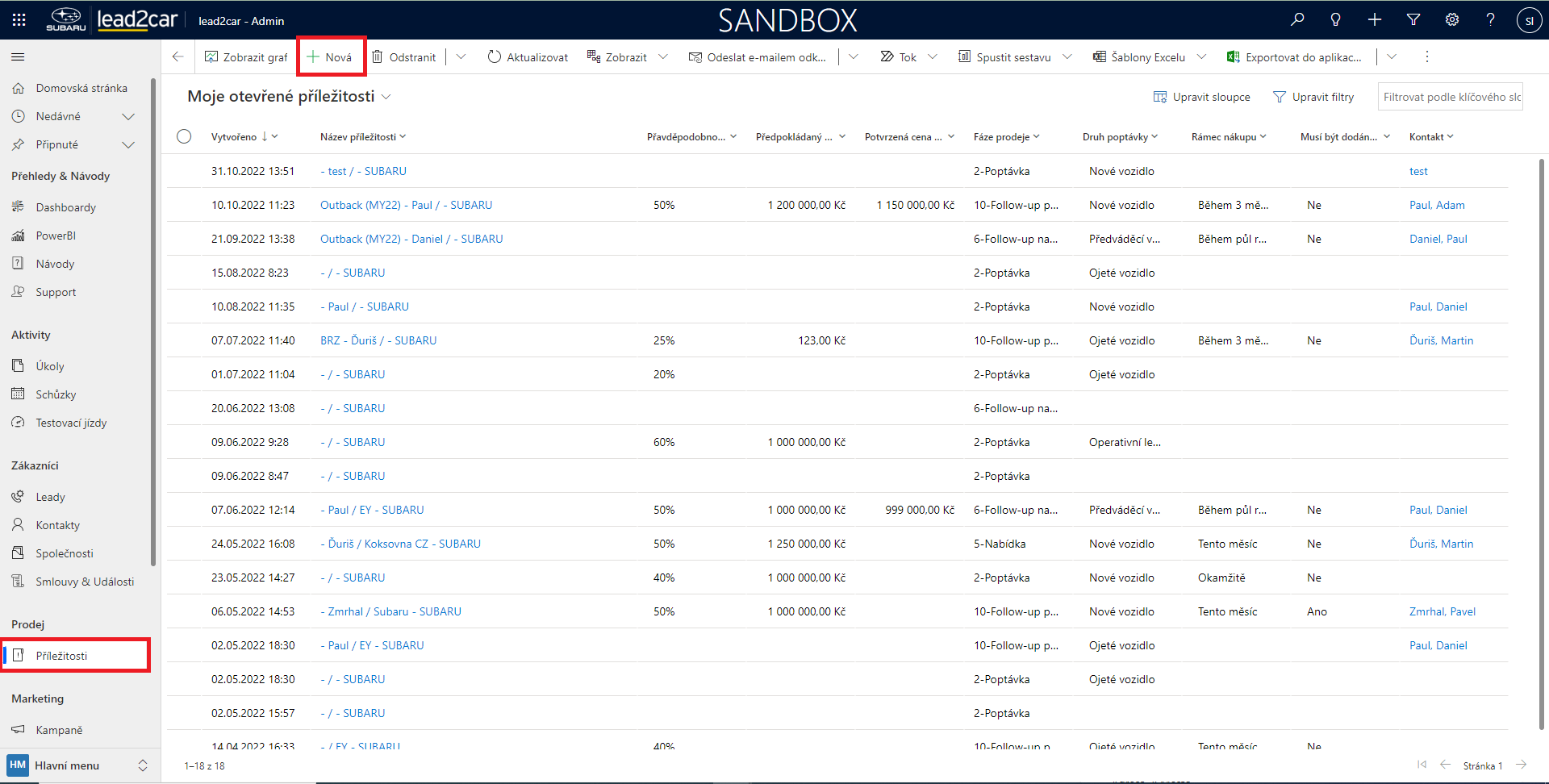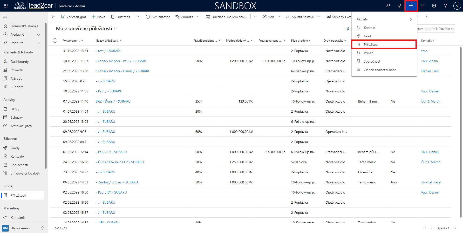 Nyní si ukážeme proces vytvoření nové příležitosti. Novou Příležitost lze vytvořit dvěma způsoby. Pomocí výběru tlačítka "Příležitosti" v levé liště a následným kliknutím na "+ Nová" v horní listě, případně lze kliknout na tlačítko plus v pravém horním rohu a zvolit možnost "Příležitost".