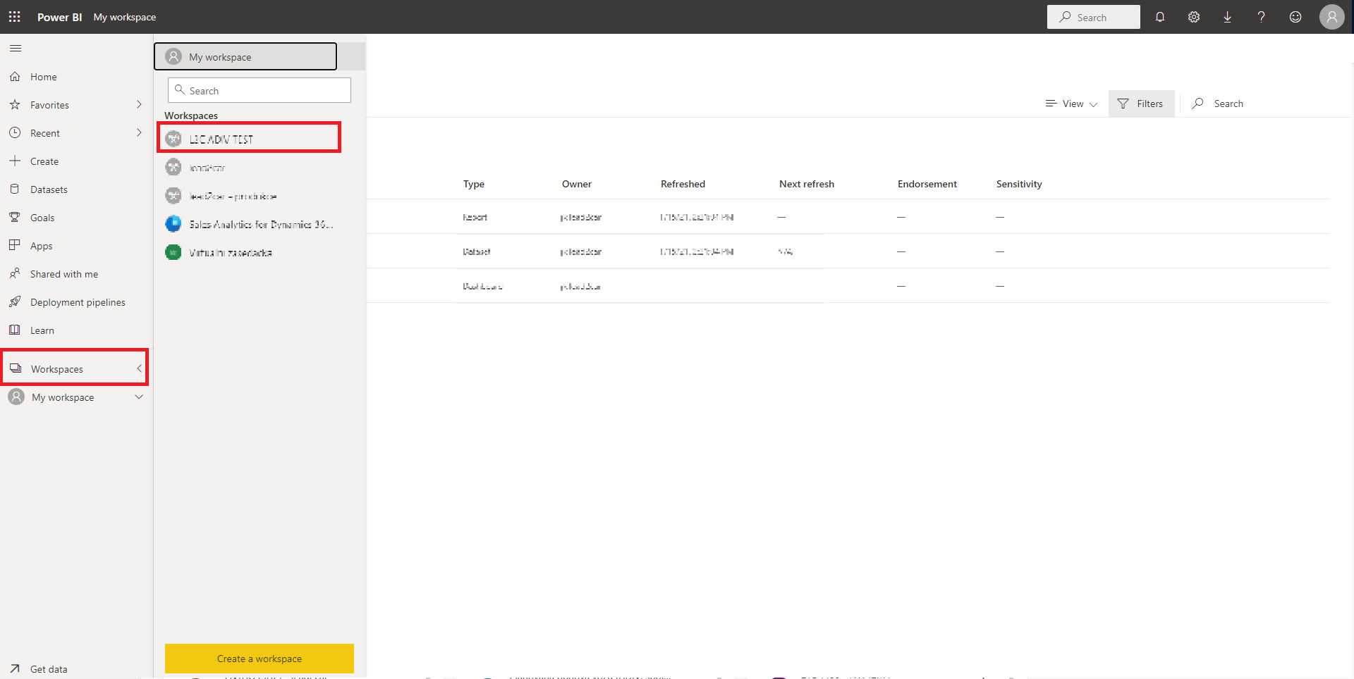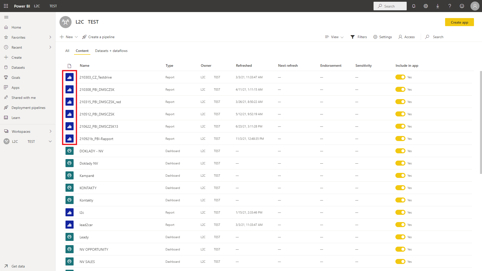 Na webu powerbi.com vyberte z daného workspacu soubor, ve kterém se žádaný dashboard nachází. Dashboardy jsou označeny modrým čtverečkem s ikonou grafu.