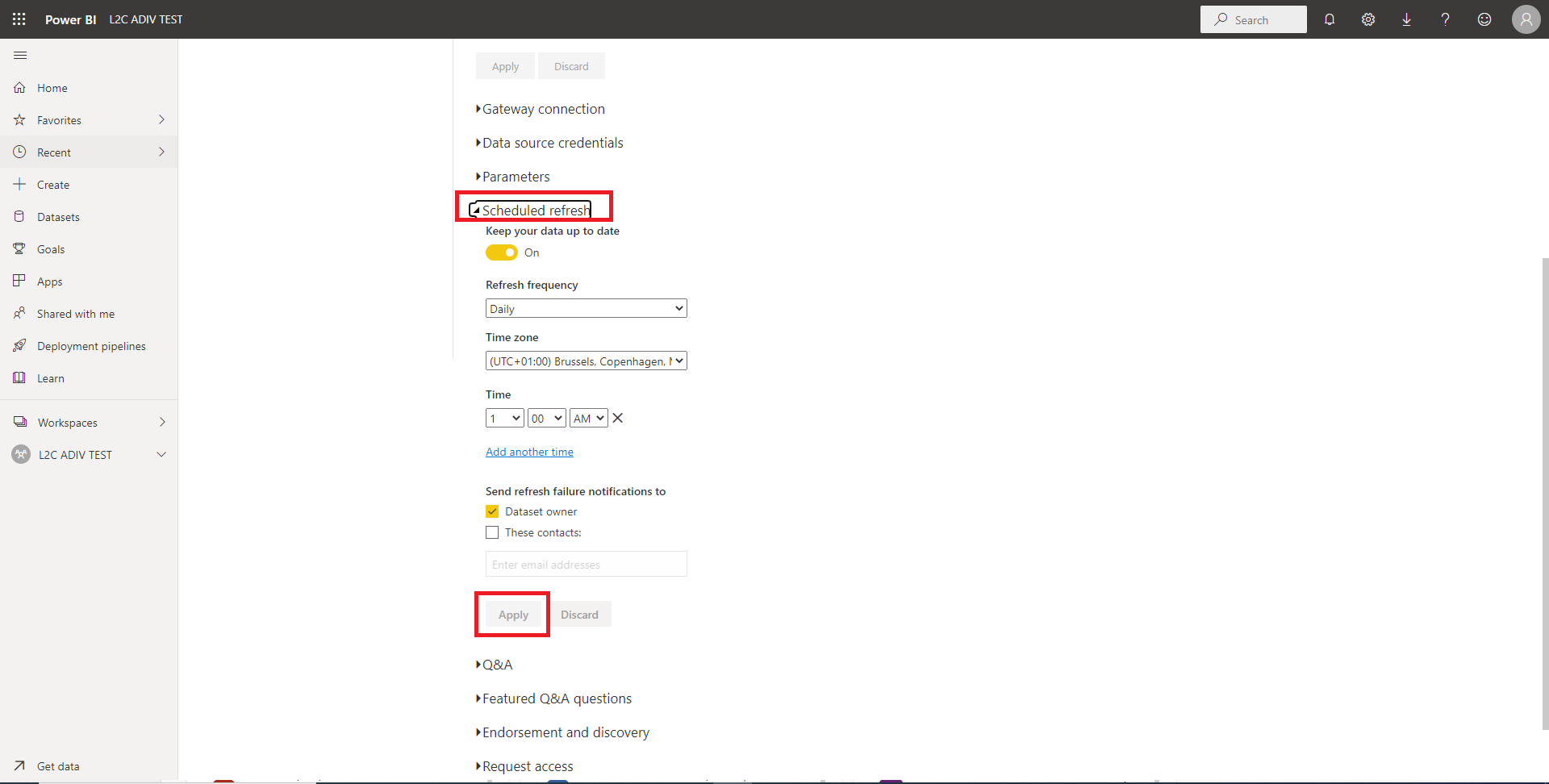 Rozklikněte si možnost ,,Scheduled refresh", a zvolte si parametry vaší aktualizace. Můžete si vybrat v jaké časy, a jak často má aktualizace probíhat. Následně svou volbu pouze potvrďte zmáčknutím tlačítka "Apply".