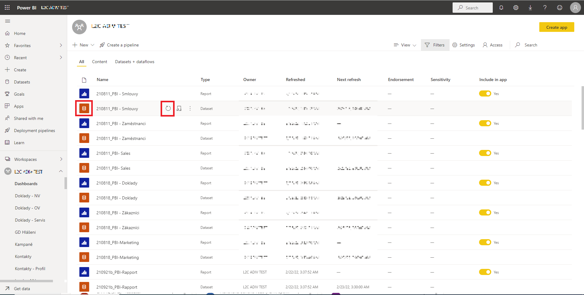 Zde vyberte dataset, pro který chcete nastavit aktualizaci. Ikonky datasetů mají oranžovou barvu. Na daný dataset najeďte myší, a následně zvolte ikonku nalevo, která se vám objeví s názvem "Refresh now".