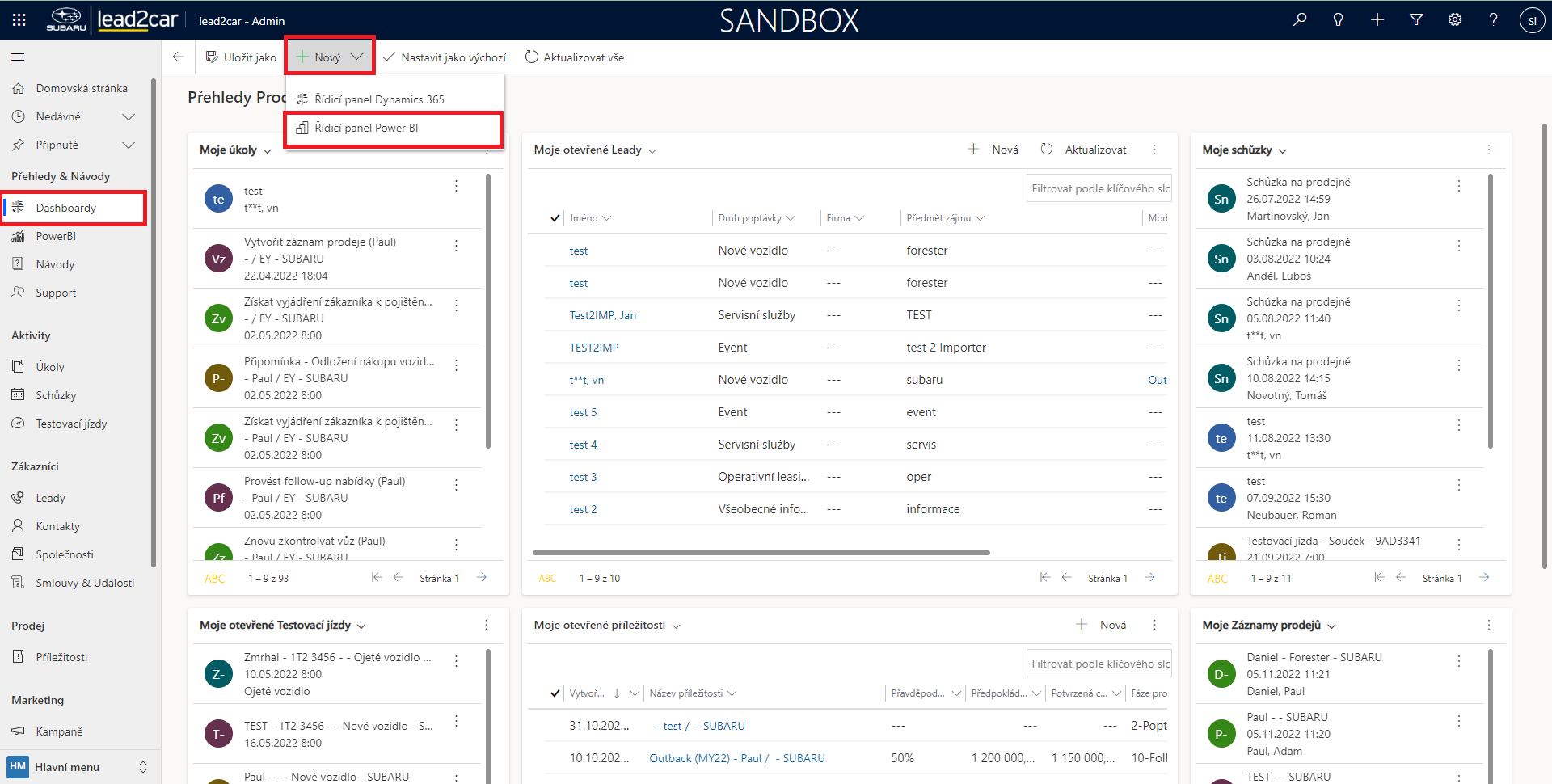 Pokud máte vytvořené vaše power BI, tak ho ještě musíte nahrát do Lead2car. Z panelu nalevo musíte zvolit "Dashboardy". Dále zmáčknete "Nová" z horního menu, a z možností co se vám objevili zvolíte "Řídící panel power BI".