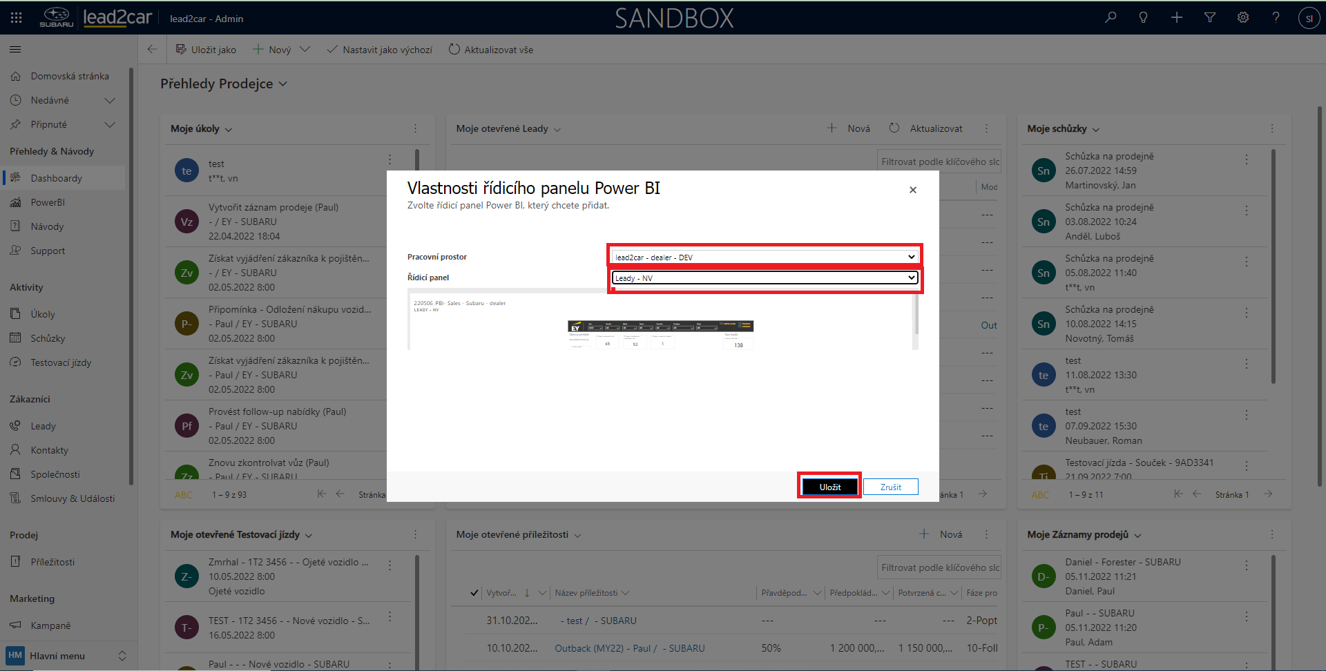 Otevře se vám nová karta s názvem Vlastnosti řídícího panelu Power BI. Zde si vyberete v jakém pracovním prostoru se nachází váše Power BI, a zvolíte ho v kolonce "řídící panel". Objeví se vám ukázka vašeho Dashboardu, a pokud je to váš dashboard, tak jednoduše zmáčknete "uložit", a váš Dashboard je nahraný v Lead2car.