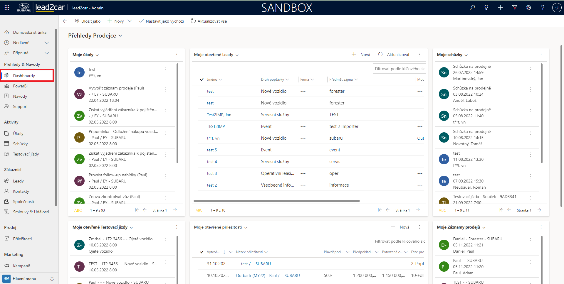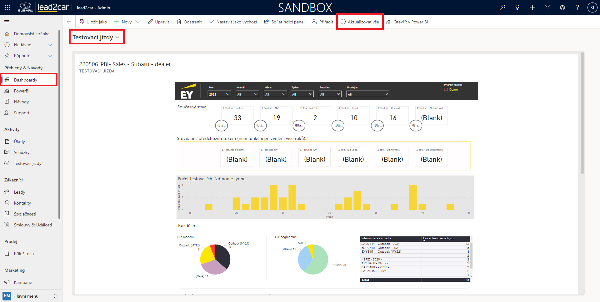Poslední věc, kterou byste měli udělat, je vrátit se na hlavní stránku lead2car. Zde v menu nalevo zvolte "Dashboardy", a pomocí ikonky nahoře zvolte konkrétní Dashboard, který chcete aktualizovat. V něm vám stačí jednoduše zvolit možnost "Aktualizovat vše" z horního menu, a máte hotovo.