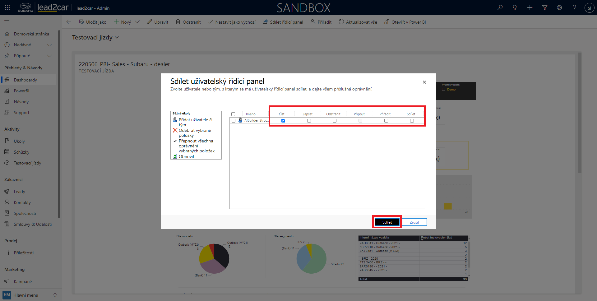 V tabulce můžete vidět vámi nově přidané uživatele. Pomocí zaškrtávání jednotlivých oken jim zde můžete určit pravomoci. Základní pravomoc je "Číst", díky které může pouze vidě dashboardy, ale nemůže s nimi nic dělat. Další pravomoci jsou například možnost mazat Dashboardy (Odstranit), a nebo možnost sdílet dashboardy s dalšími uživateli (Sdílet). V momentě kdy toto máte hotové, tak svoji volbu jednoduše potvrdíte pomocí tlačítka "sdílet".
