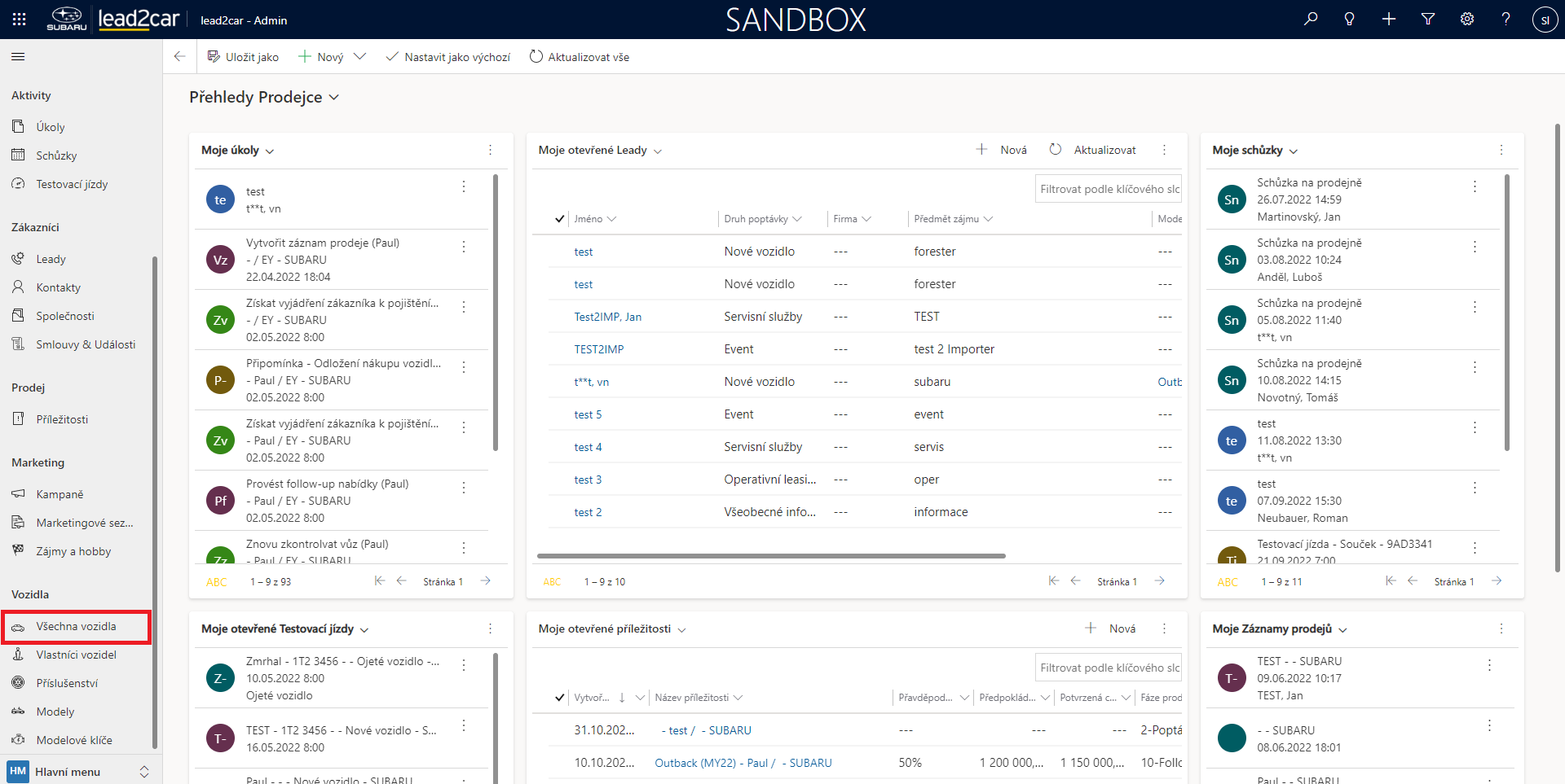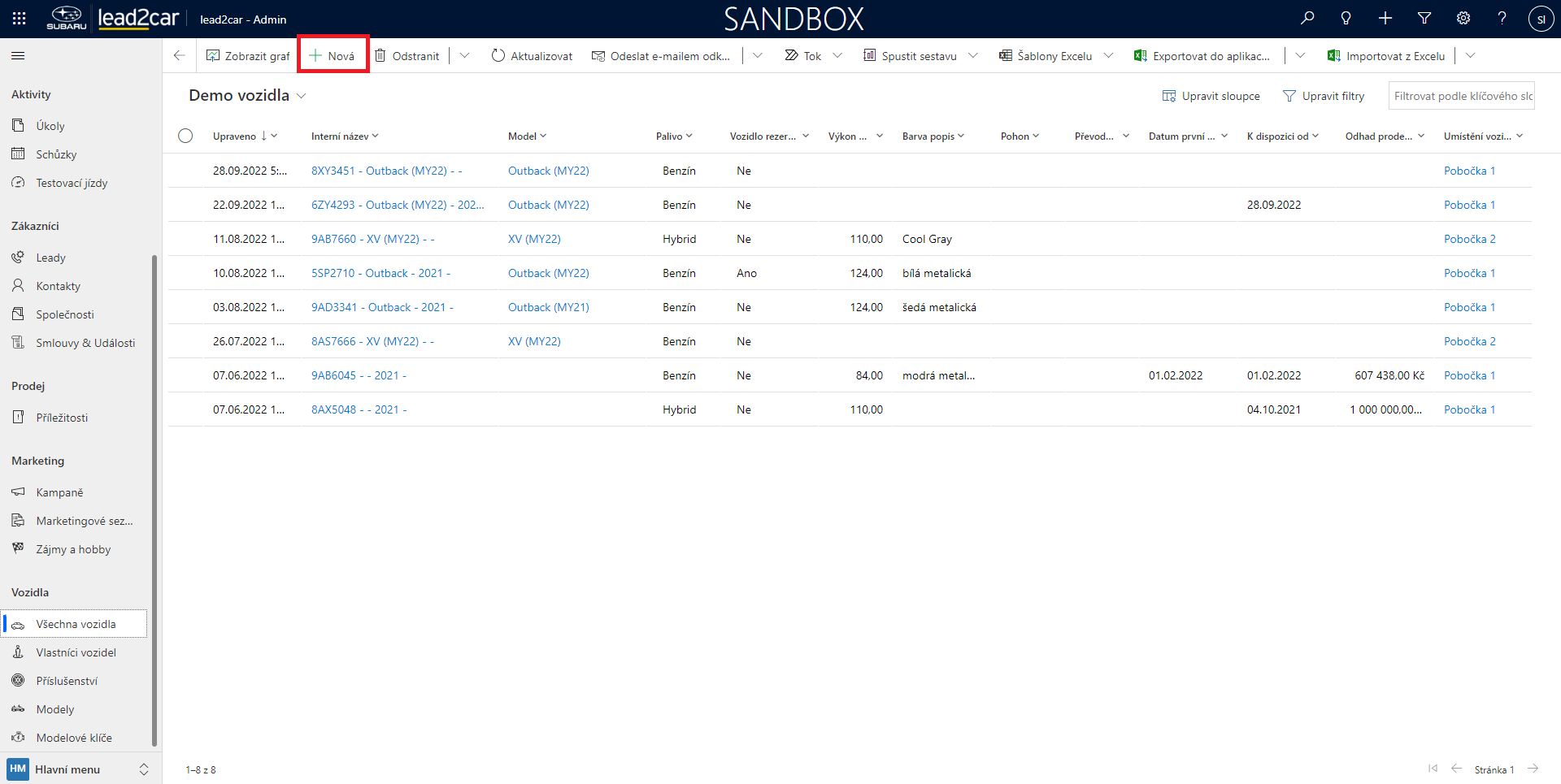 Údaje o vozidlech se v lead2car zadávají ručně. Pro vytvoření záznamu o vozidle vyberte z levého menu možnost Všechna vozidla. Následně se zobrazí celý seznam vozidel.