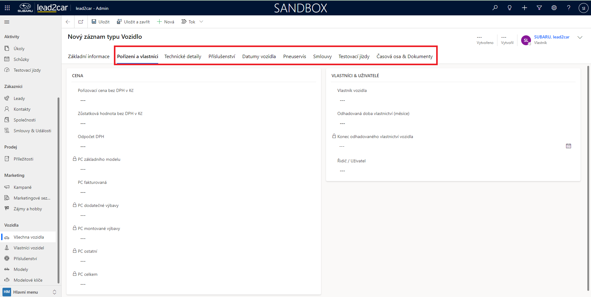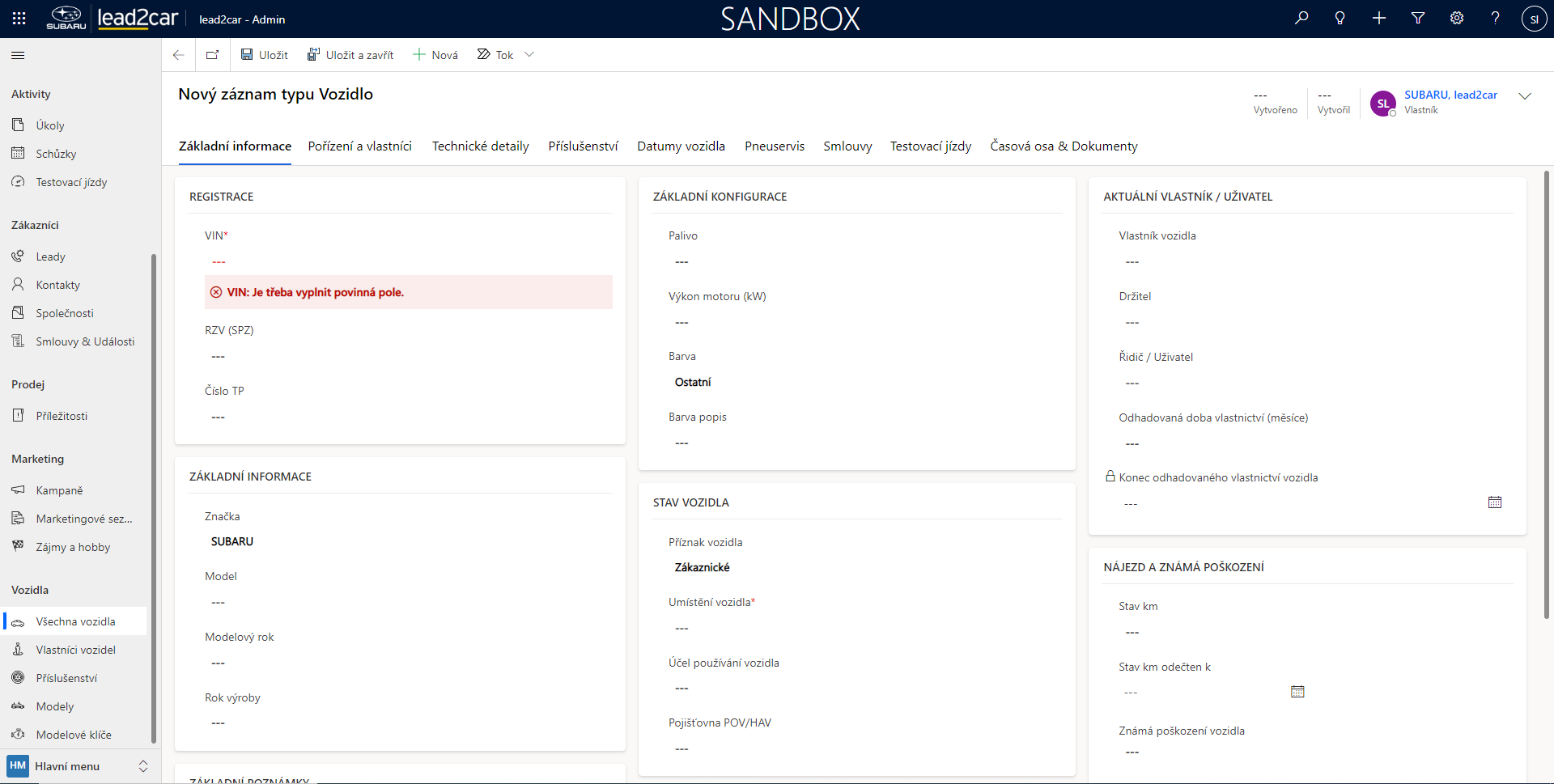 Pro zařazení informací o novém vozidle vyberte z horního panelu možnost "+ Nová". Následně se otevře formulář pro vyplnění informací o novém vozidle.